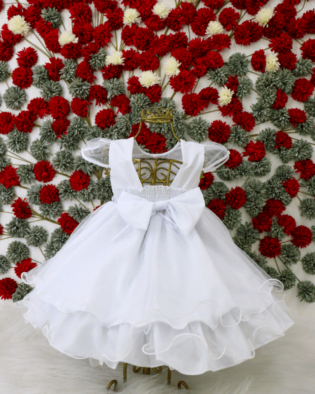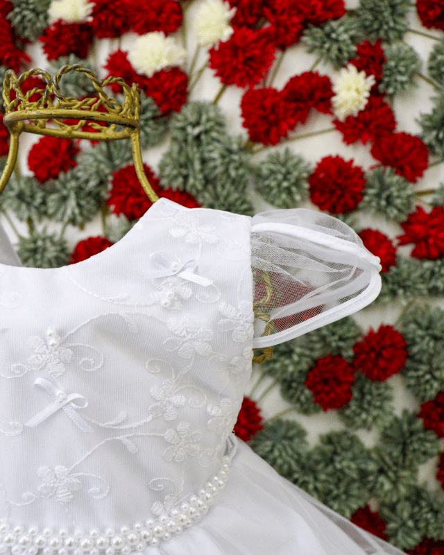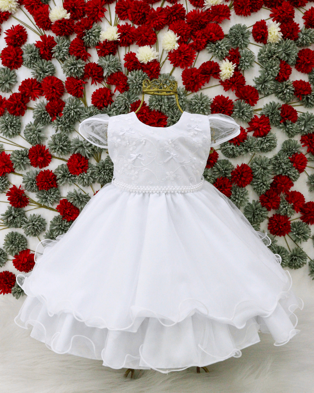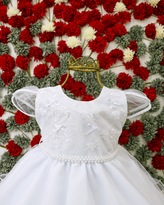 Vestido, manga curta, com peito rendado super delicado saia em tule, cinto de pérolas e costa elástica para melhor ajuste ao corpo.