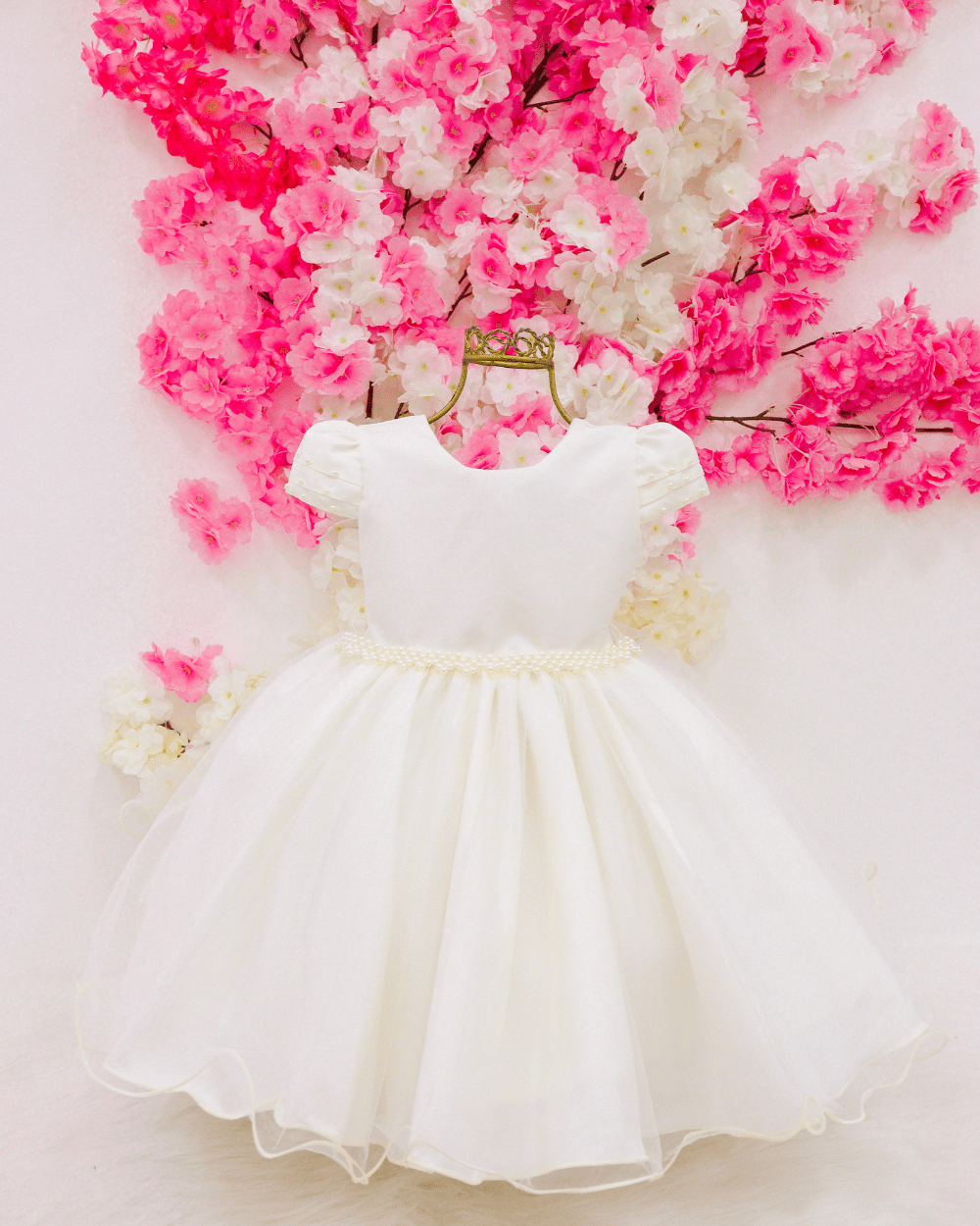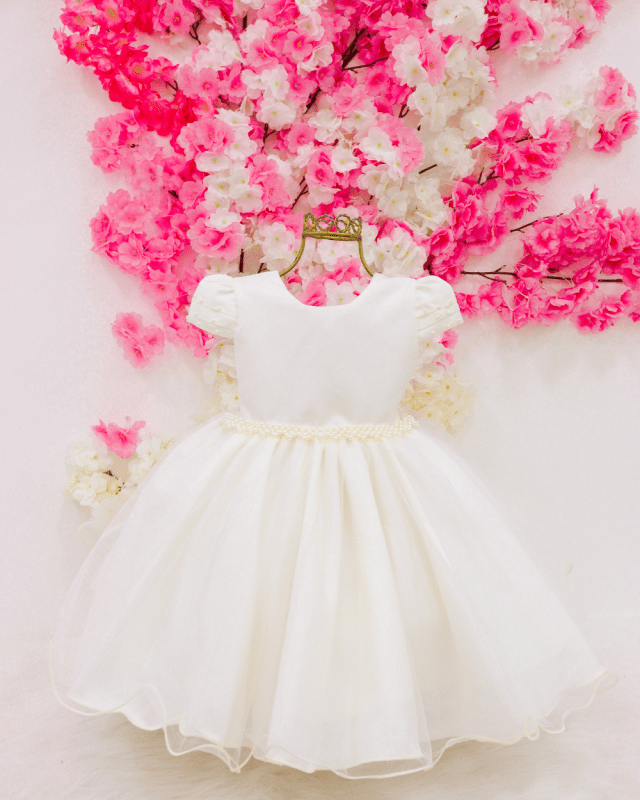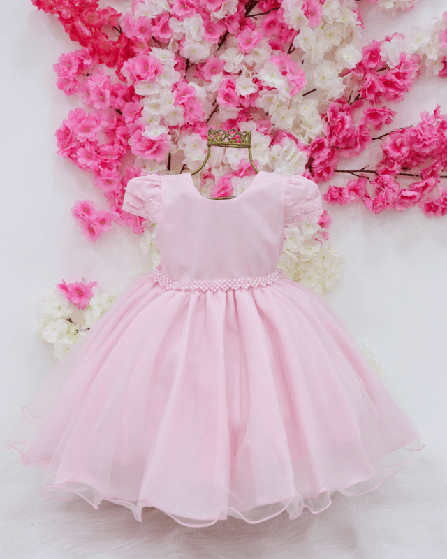 Vestido caracoles, manga curta disponível em 4 cores, super delicado saia em tule, cinto de pérolas e costa elástica para melhor ajuste ao corpo.