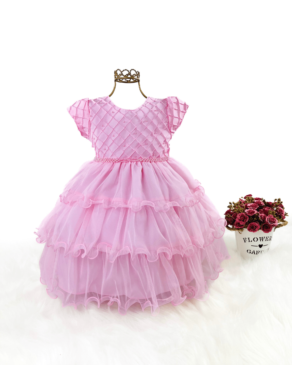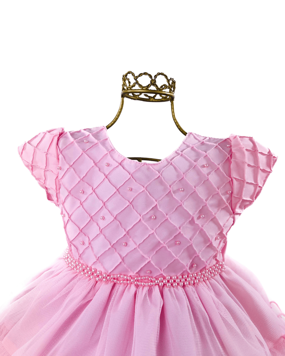 Vestido infantil manga curta, peito com apliques de pérolas com detalhes casa de abelha. cinto de pérolas sintéticas não removível, saia lisa com babados de tule, elástico nas costas ajustável ao corpo.