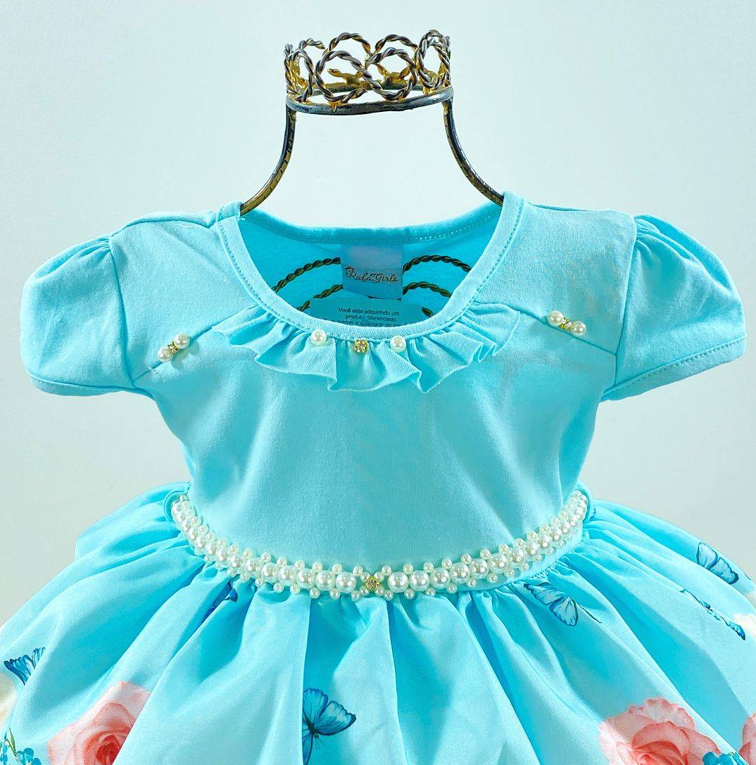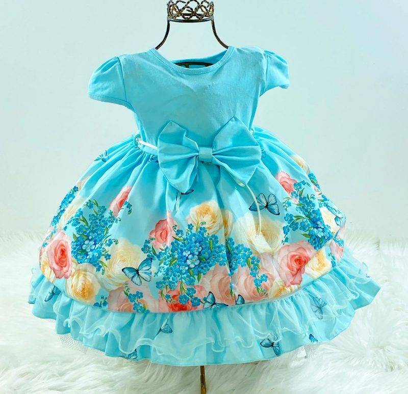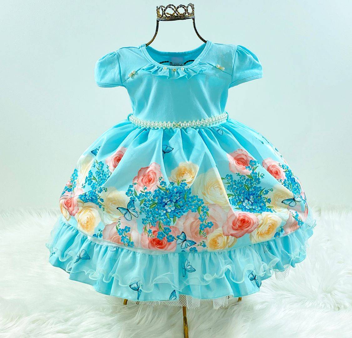 Vestido infantil festa, forrado, manga curta, estampa floral fundo azul, ombro com aplicação de pérolas sintéticas, saia com acabamento na barra babados. Laço nas costas.