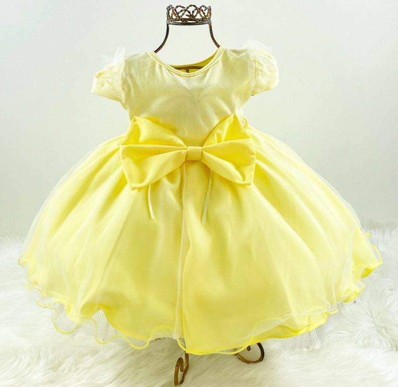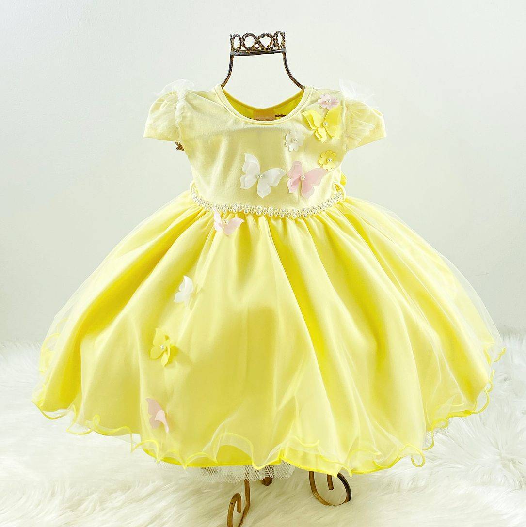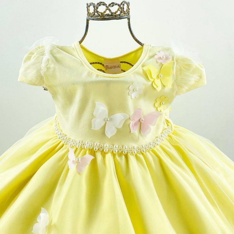 Vestido infantil festa, forrado, manga curta liso com tule e aplicações de borboletas, saia com acabamento na barra babados. Laço nas costas.