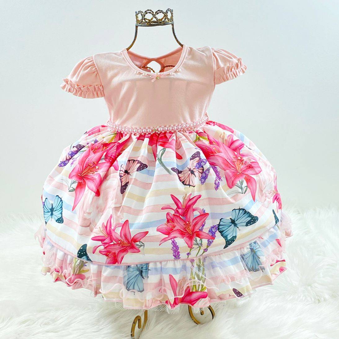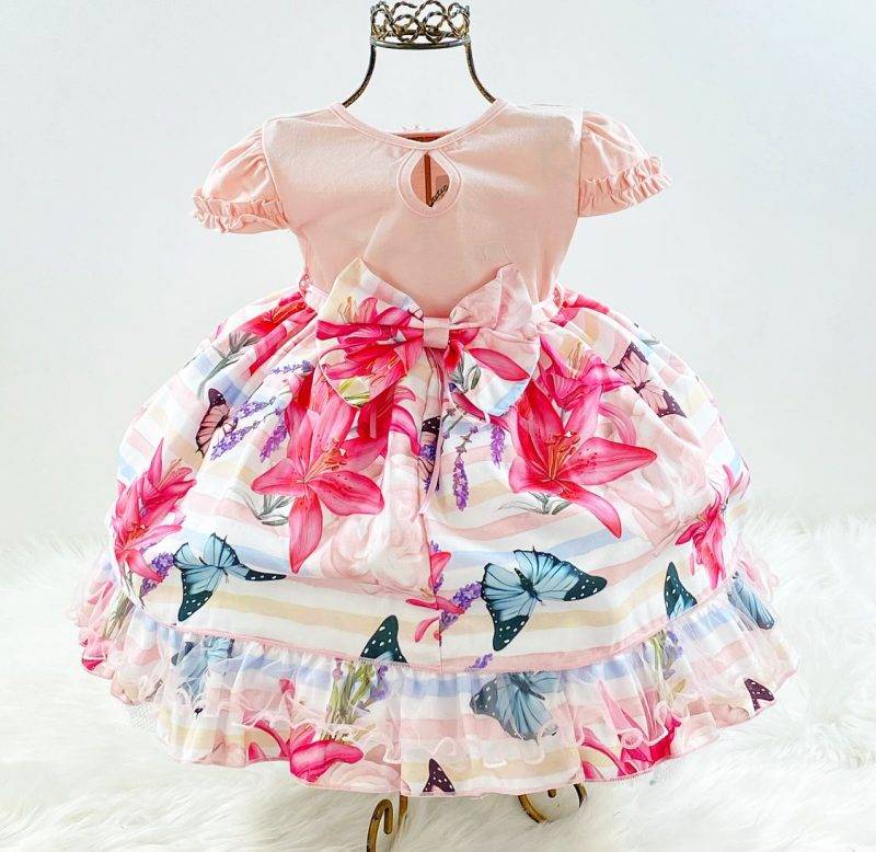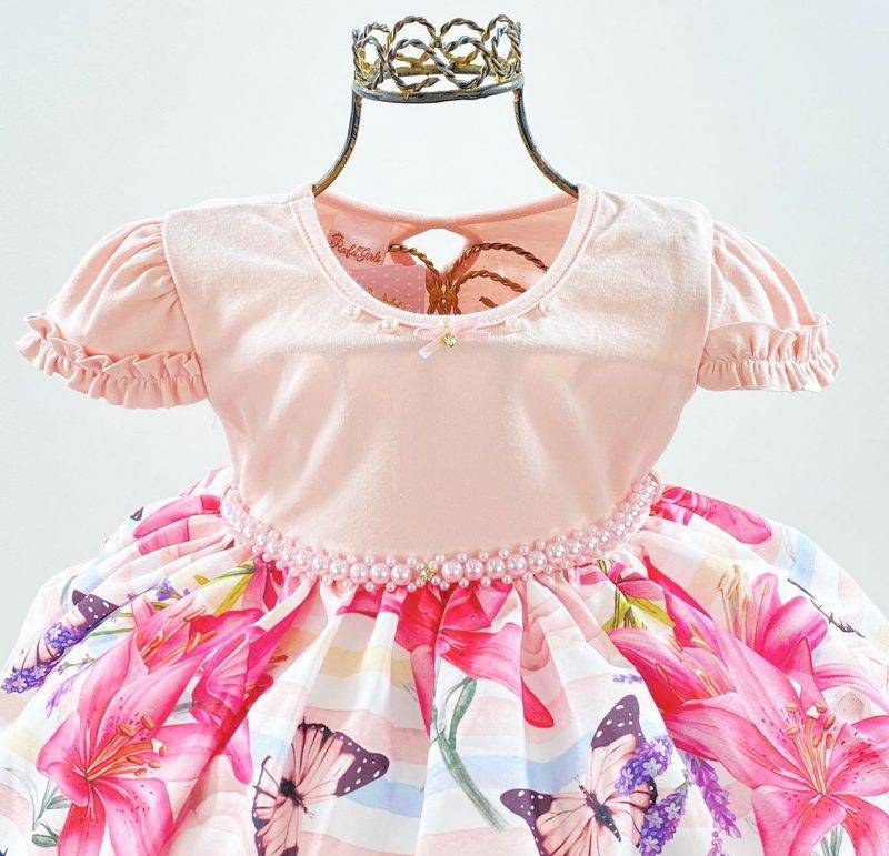 Vestido infantil festa, forrado, manga curta , estampa floral rosa, fundo rosa, saia com acabamento na barra babados. Laço nas costas.
