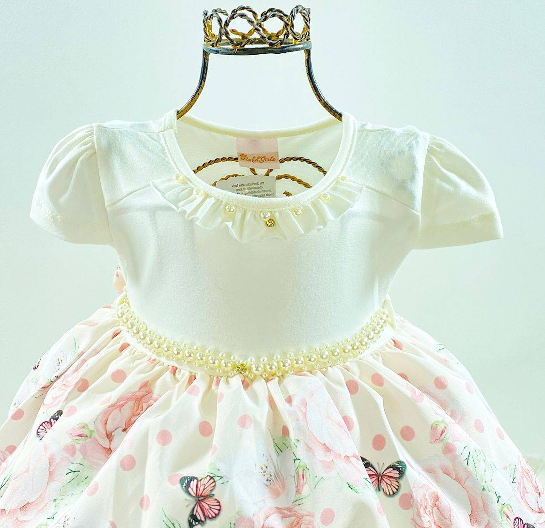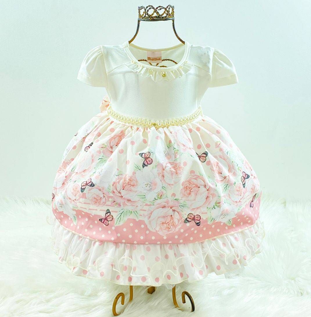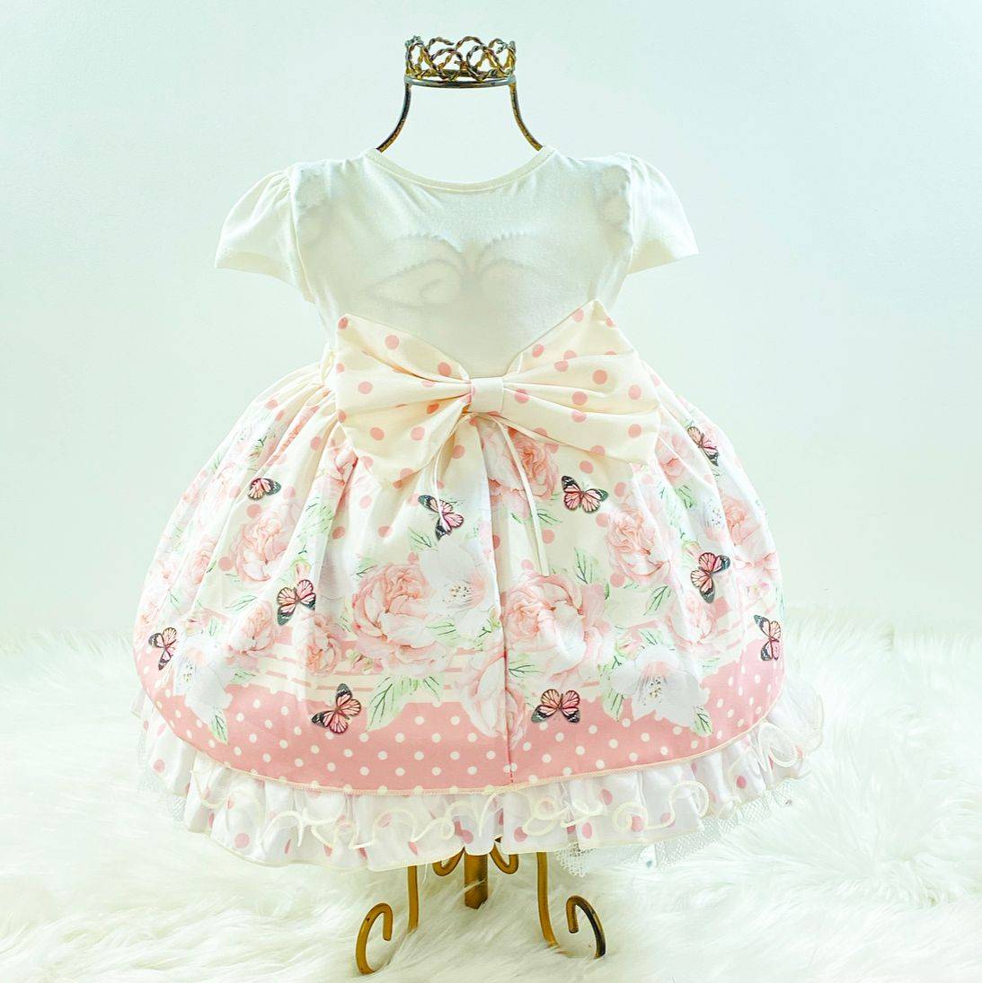 Vestido infantil festa, forrado, manga curta , estampa floral, fundo off whithe, saia com acabamento na barra babados. Laço nas costas.