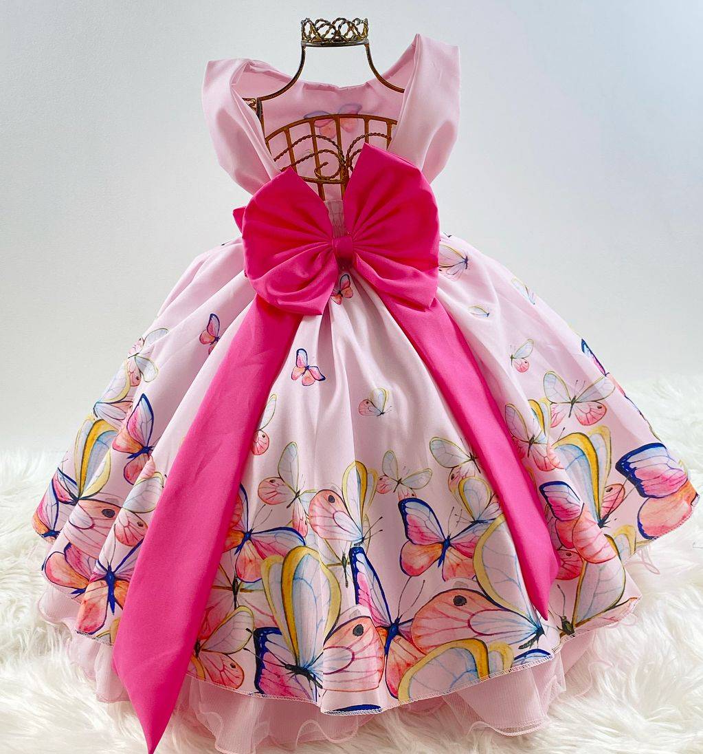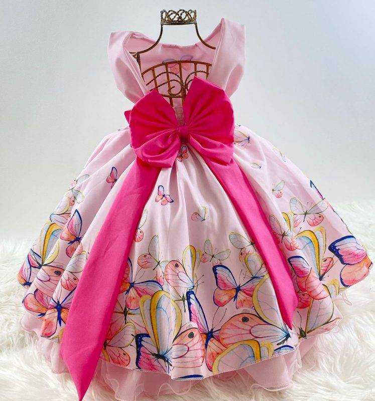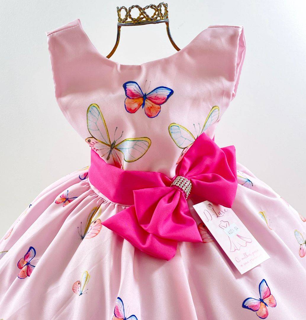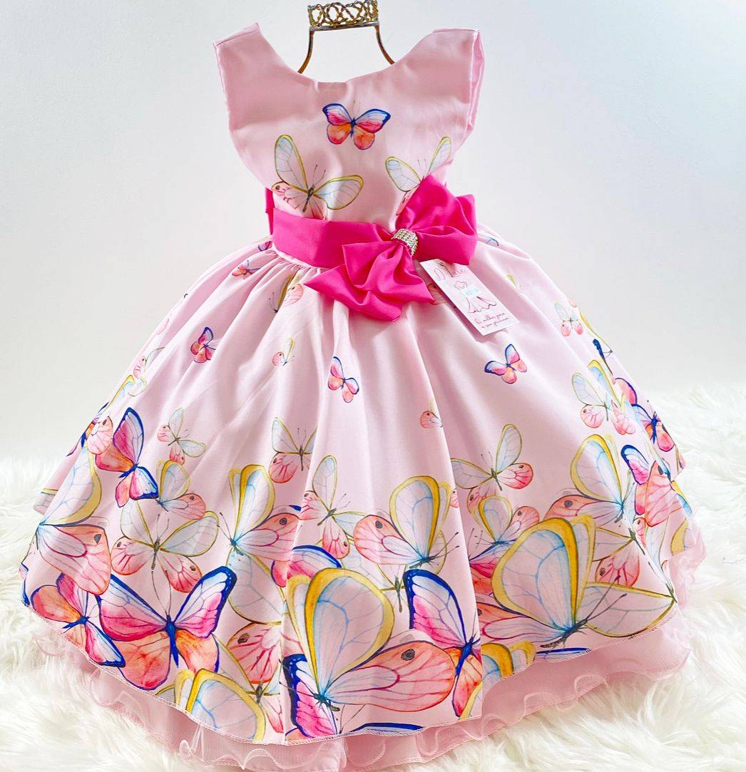 Vestido infantil regata, estampa borboletas, com acabamento simples babado de tule. Cintura com aplicação de laço