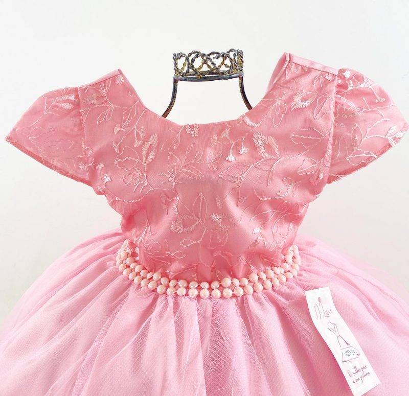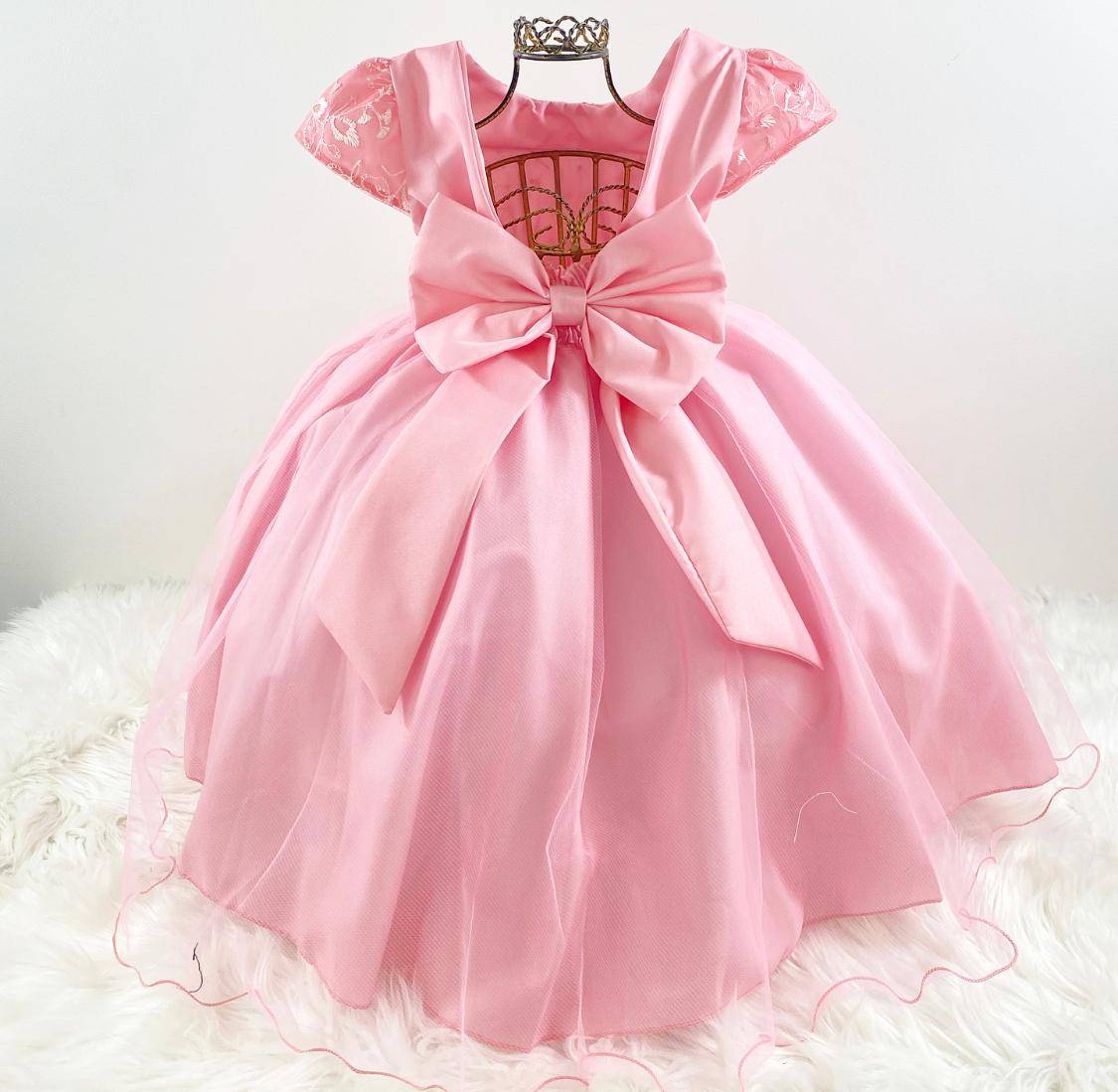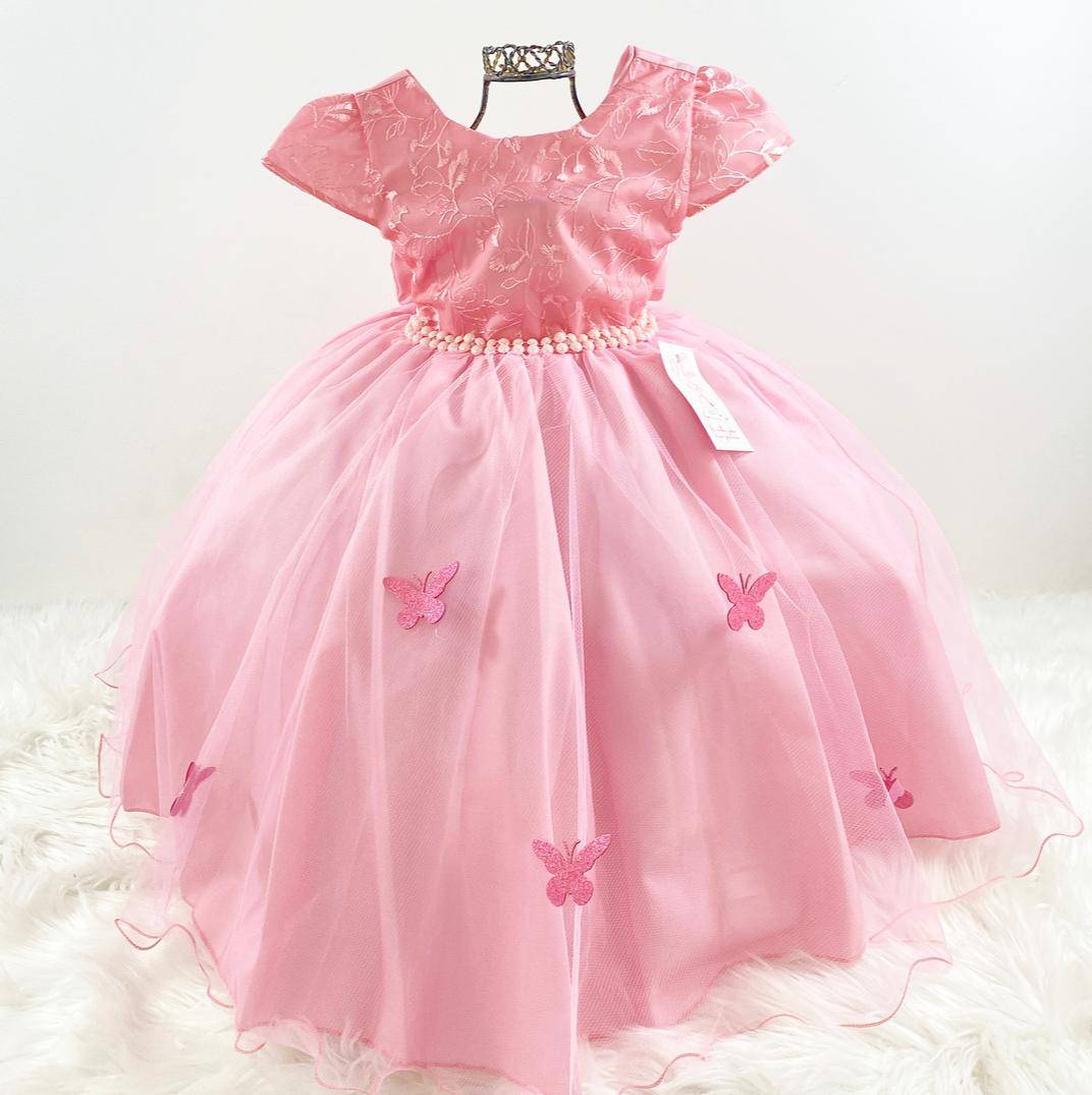 Vestido infantil manga curta, peito rosa rendado. Cintura com bordado pérolas sintéticas, saia com aplicação de borboletas com camada de tule transparente, elástico nas costas ajustável ao corpo e laço.