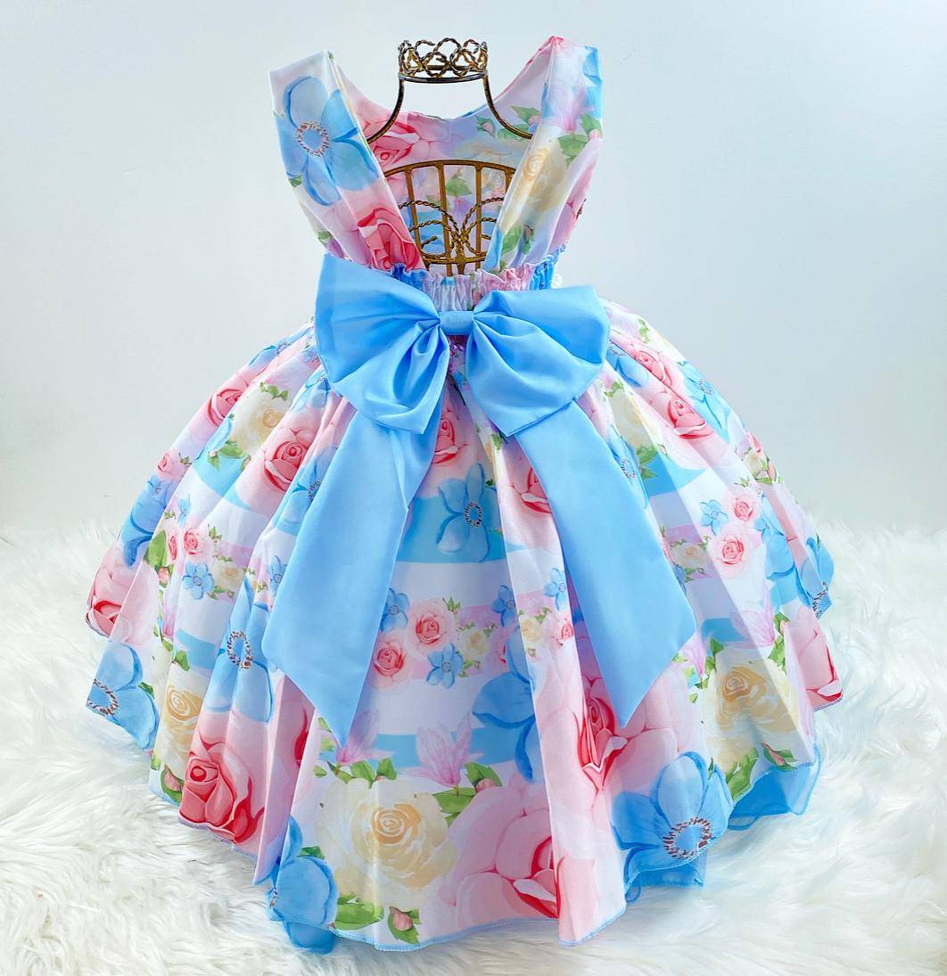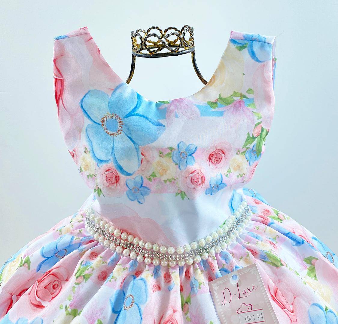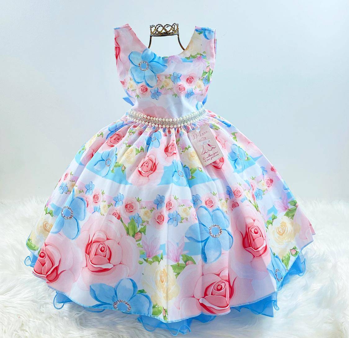 Vestido infantil regata, estampa floral, com acabamento simples babado de tule. Cintura com pérolas sintéticas rosa. Elástico nas costas ajustável ao corpo e laço.