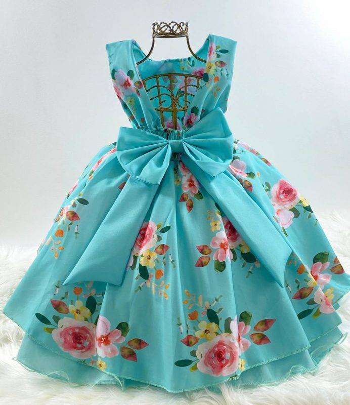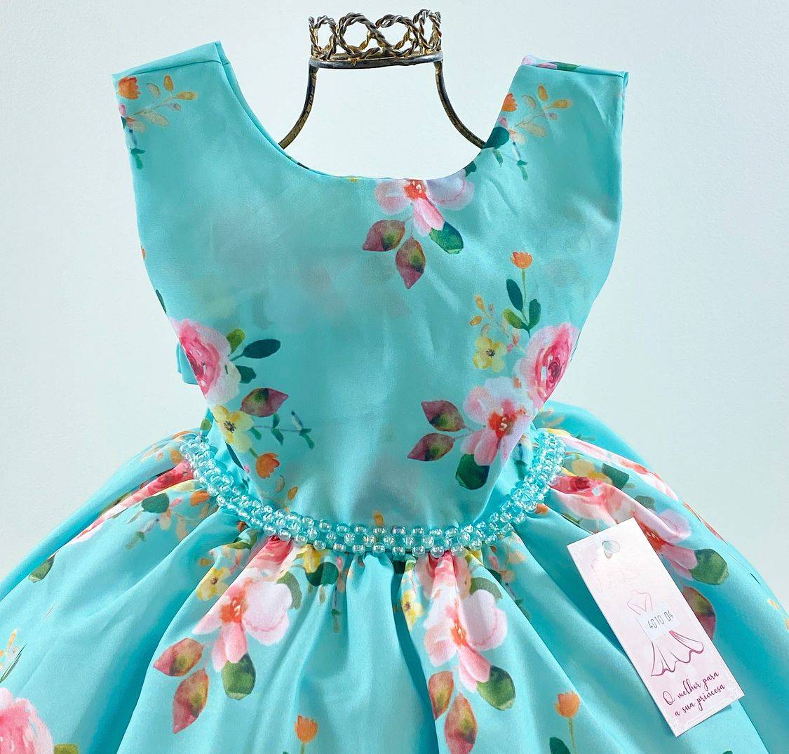 Vestido infantil regata, estampa floral, com acabamento simples babado de tule. Cintura com pérolas sintéticas rosa. Elástico nas costas ajustável ao corpo e laço.
