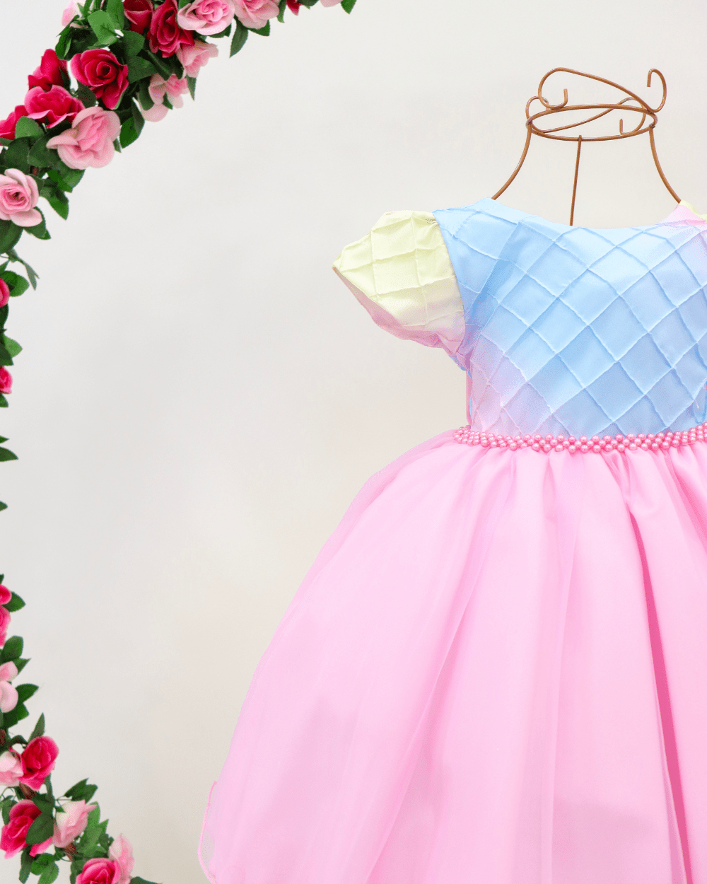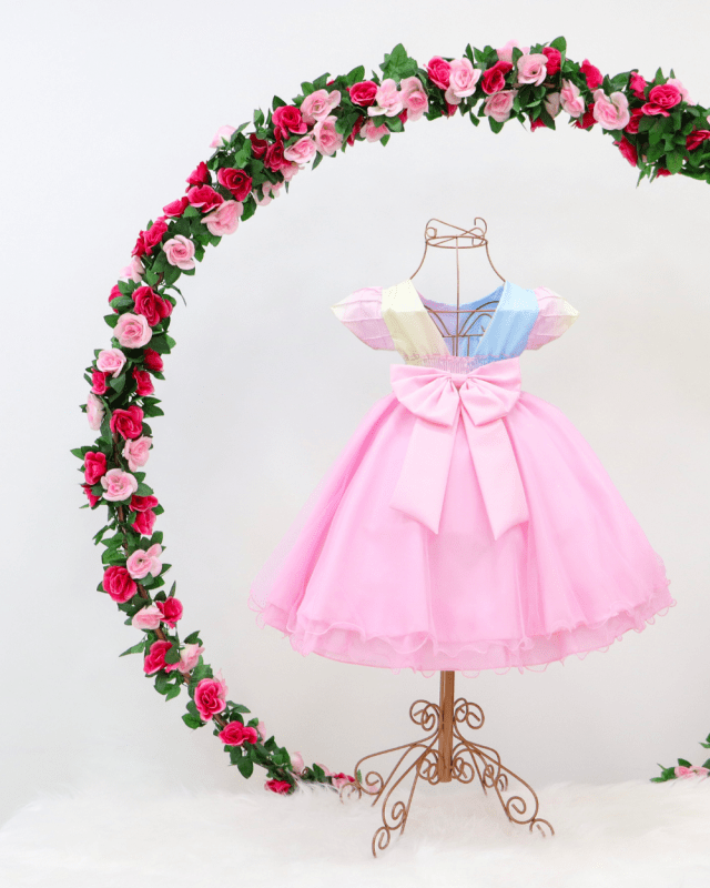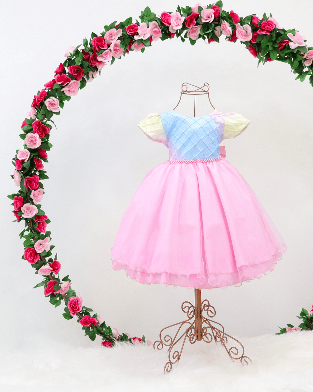Vestido infantil manga curta com forro candy colors , peito quadriculado ,saia lisa com saia de tule ,cintura com pérolas sintéticas. Elástico nas costas ajustável ao corpo e laço.
