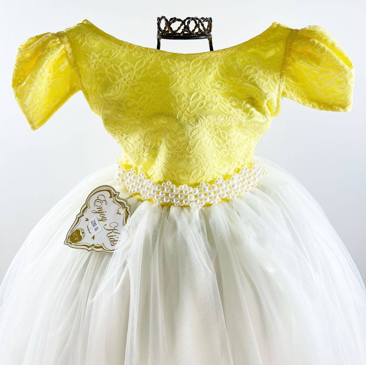 Vestido manga curta infantil festa, cetim com renda, Cintura com cintinho de pérolas sintéticas, saia lisa off white tule, com. Elástico nas costas ajustável ao corpo e laço.