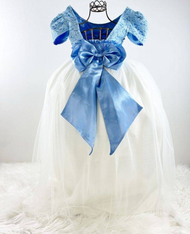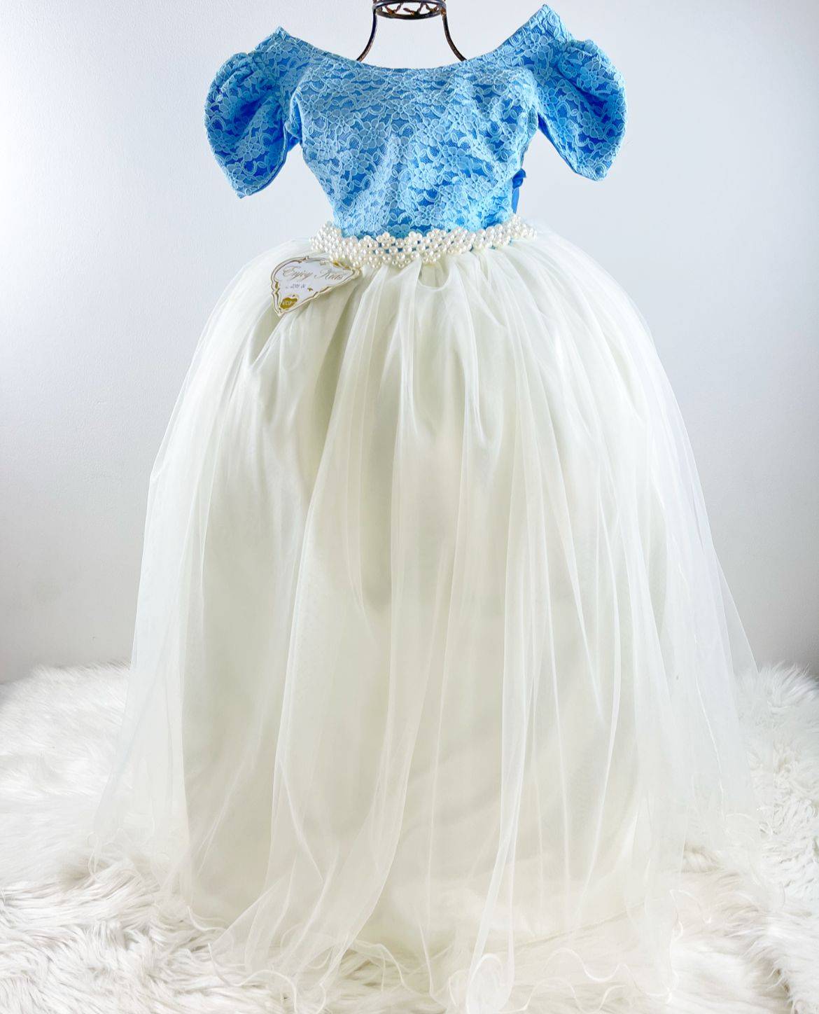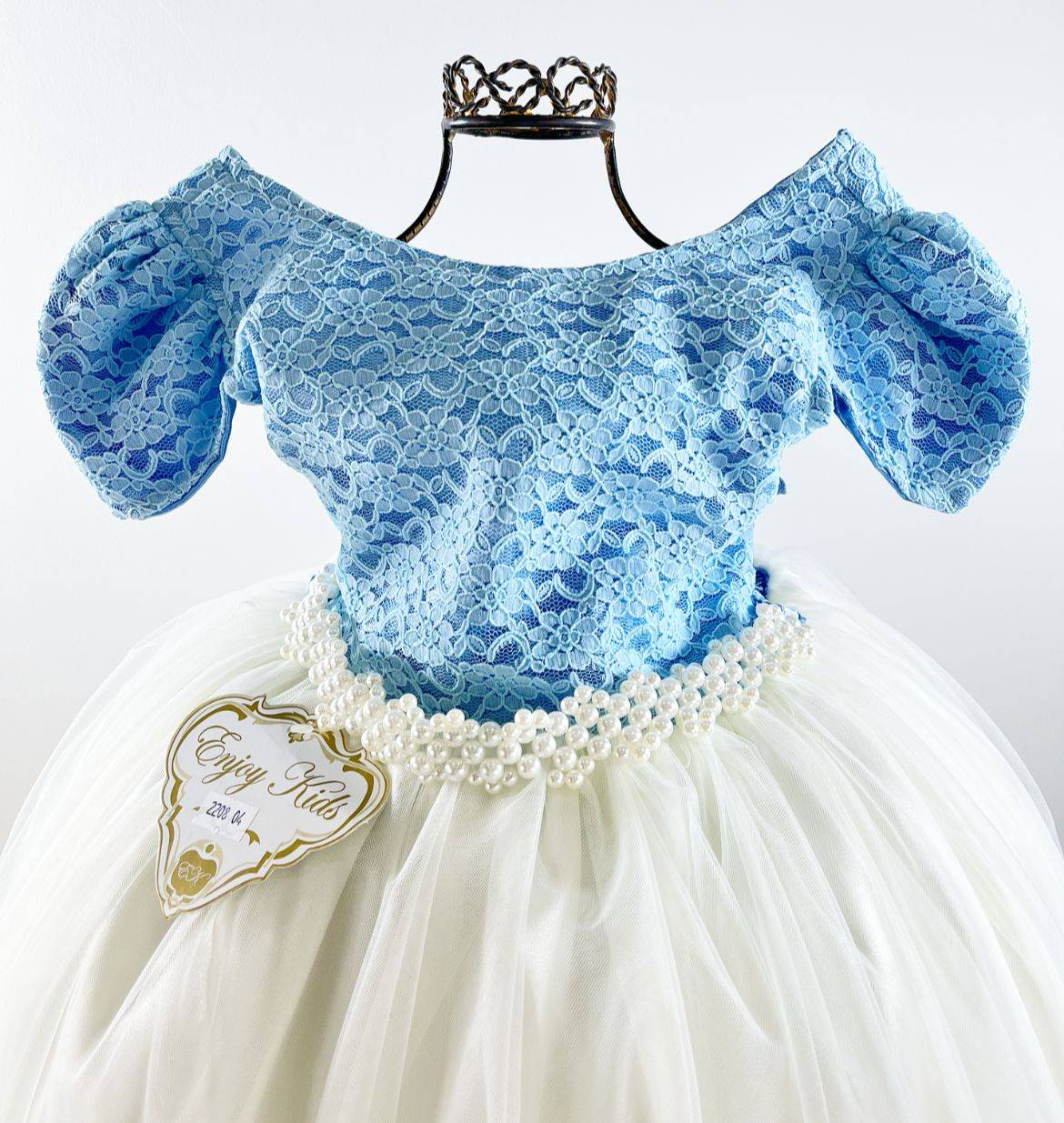 Vestido manga curta infantil festa, cetim com renda, Cintura com cintinho de pérolas sintéticas, saia lisa off white tule, com. Elástico nas costas ajustável ao corpo e laço.