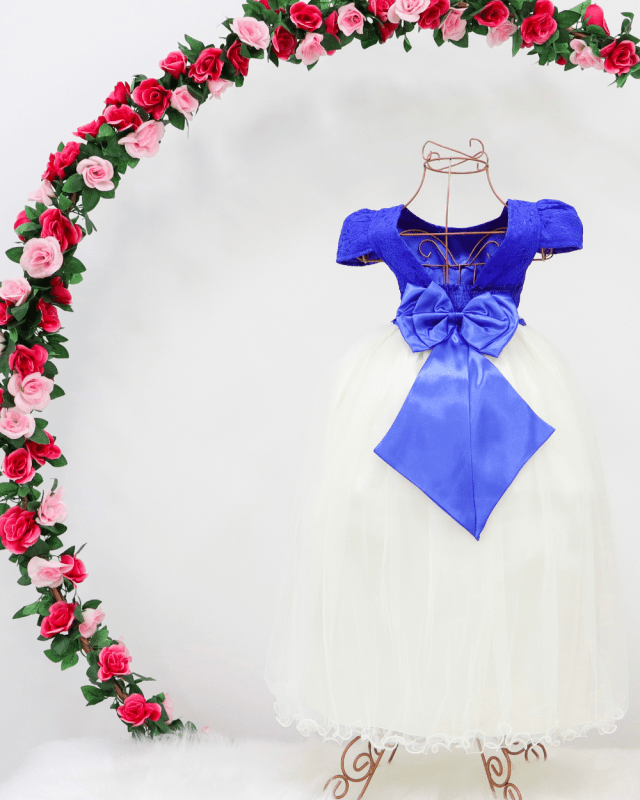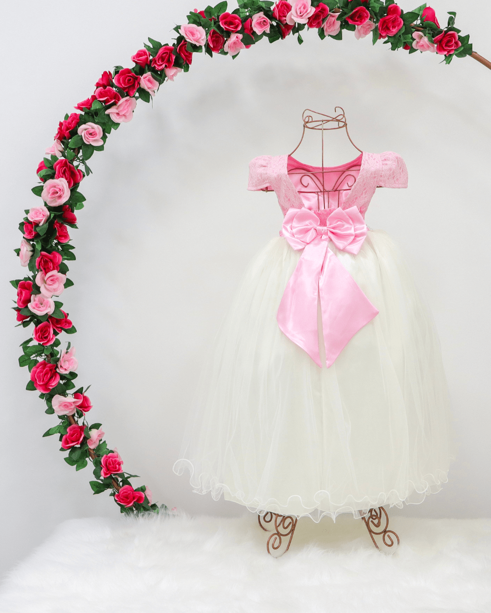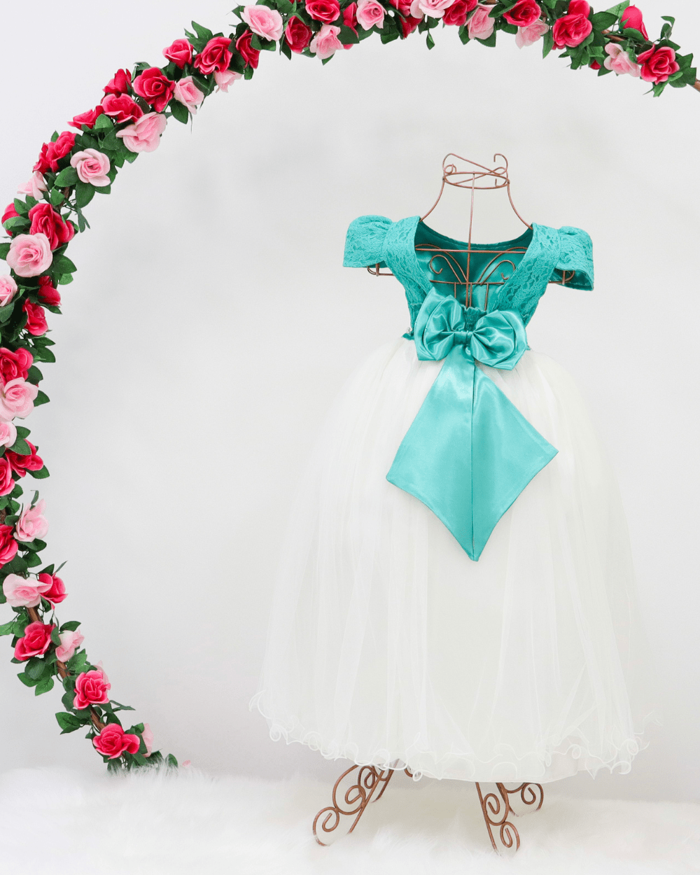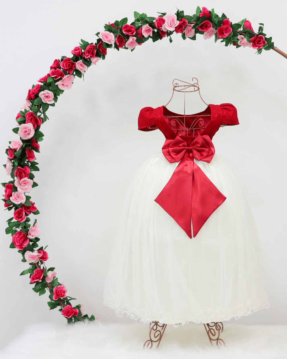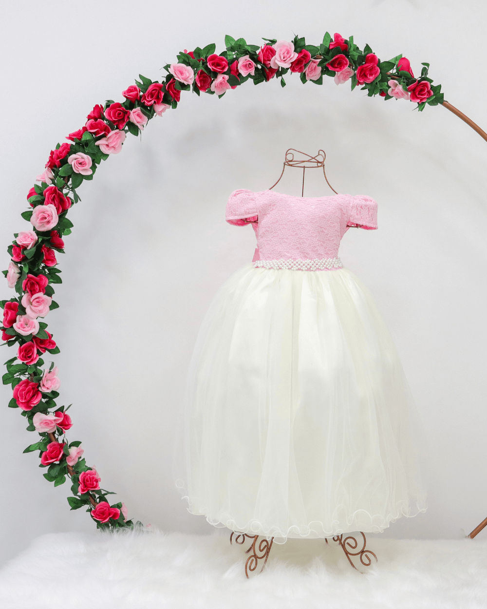 Vestido manga curta infantil festa, cetim com renda, Cintura com cintinho de pérolas sintéticas, saia lisa off white tule, com. Elástico nas costas ajustável ao corpo e laço.