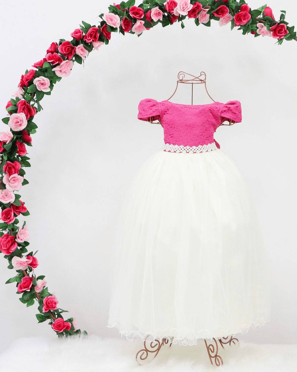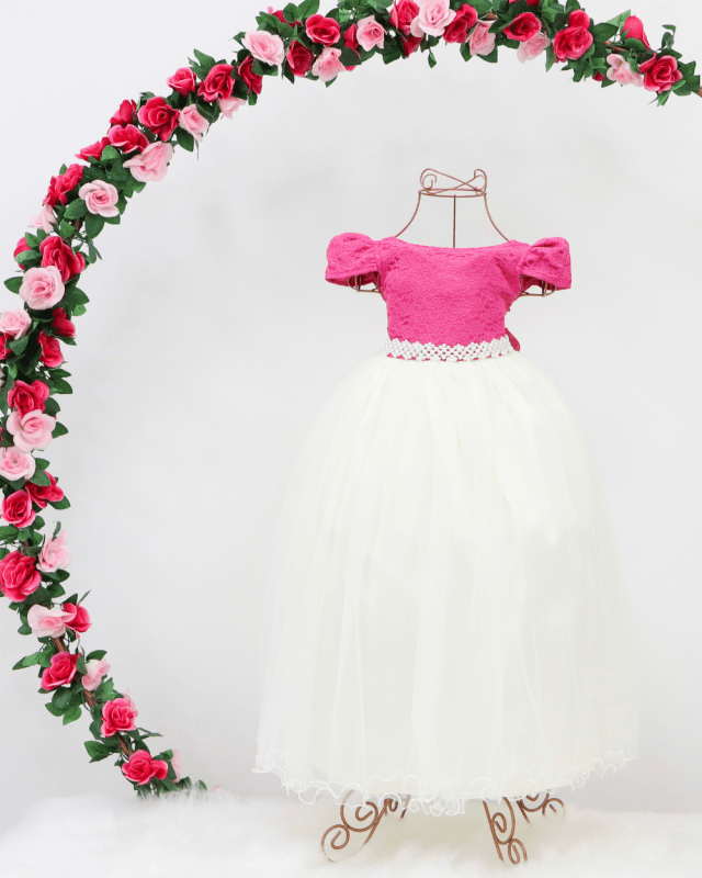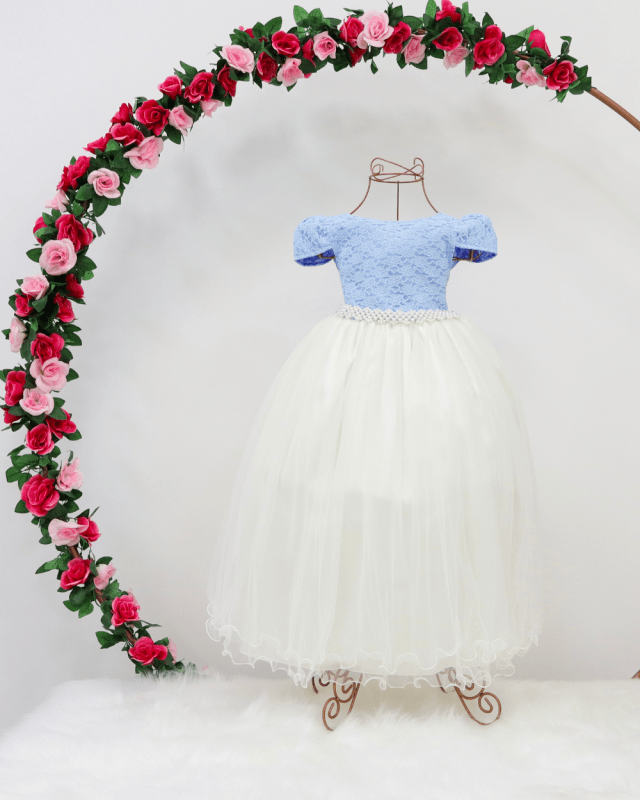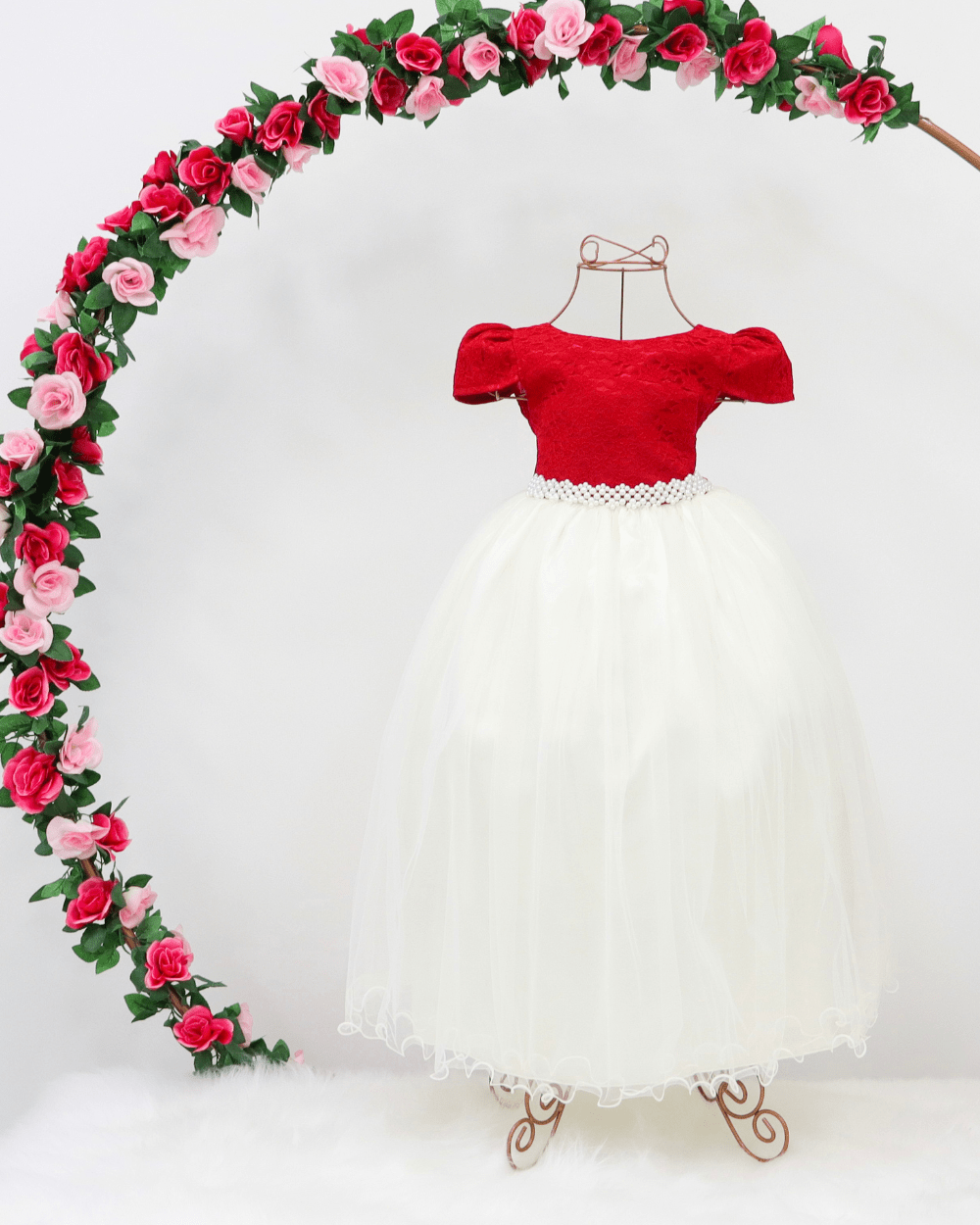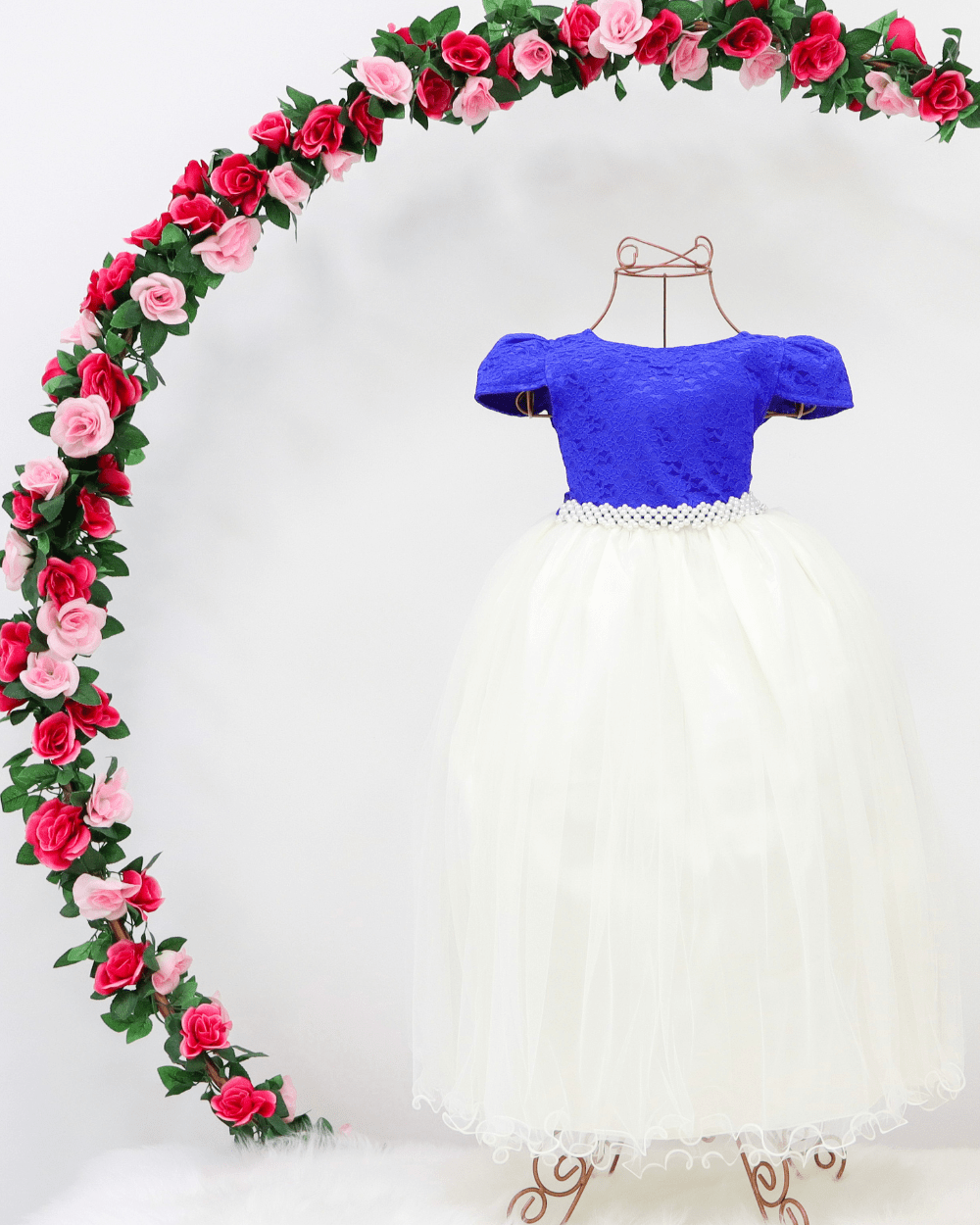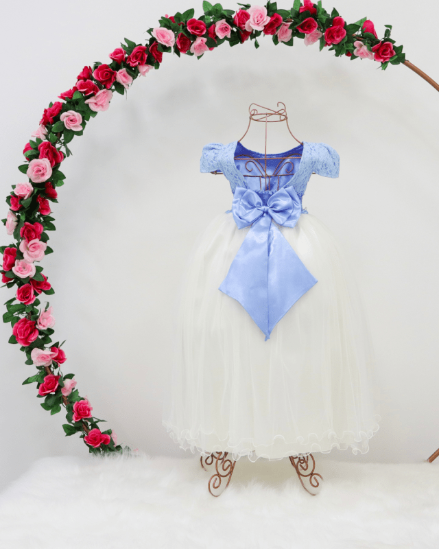 Vestido manga curta infantil festa, cetim com renda, Cintura com cintinho de pérolas sintéticas, saia lisa off white tule, com. Elástico nas costas ajustável ao corpo e laço.