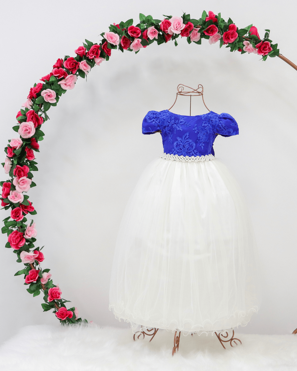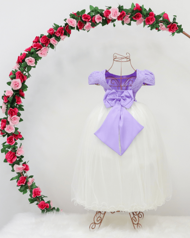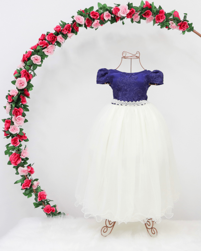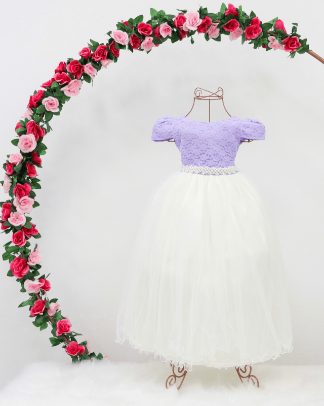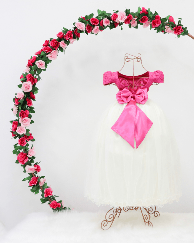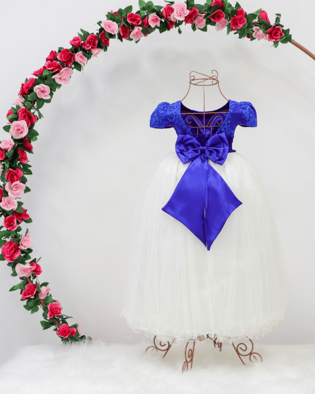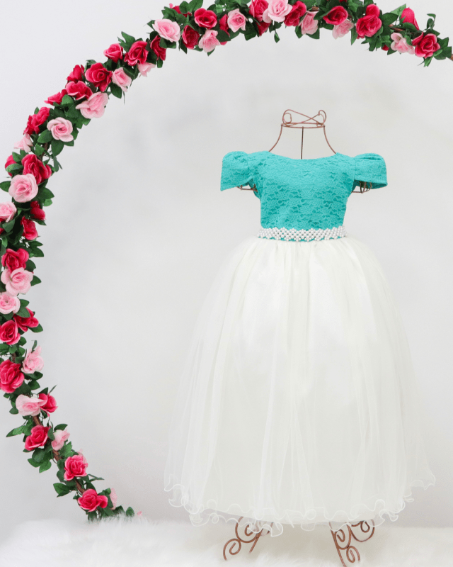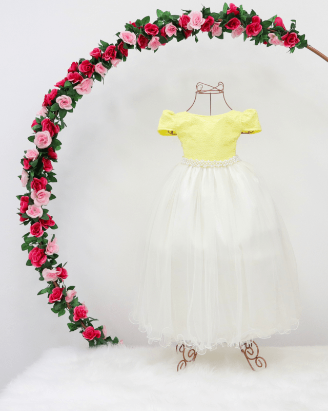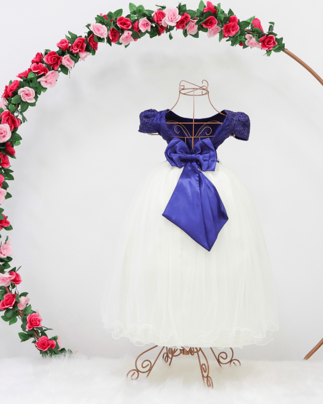 Vestido manga curta infantil festa, cetim com renda, Cintura com cintinho de pérolas sintéticas, saia lisa off white tule, com. Elástico nas costas ajustável ao corpo e laço.