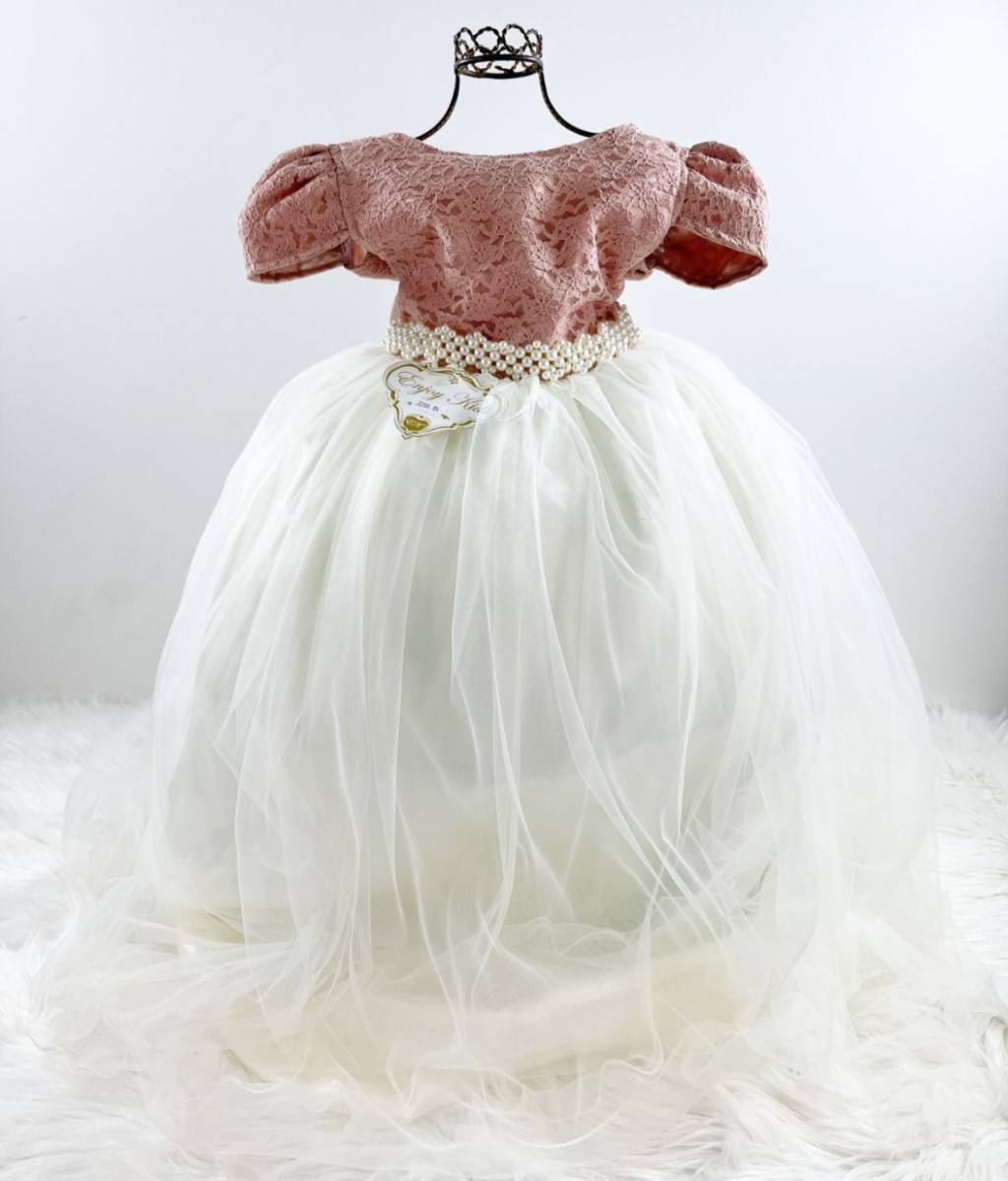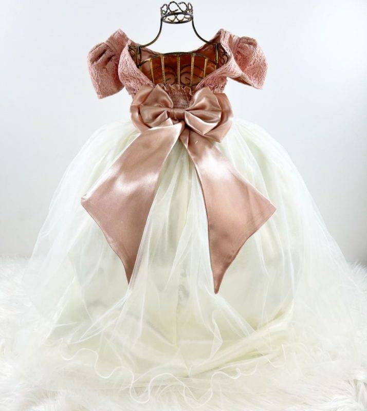 Vestido manga curta infantil festa, cetim com renda, Cintura com cintinho de pérolas sintéticas, saia lisa off white tule, com. Elástico nas costas ajustável ao corpo e laço.