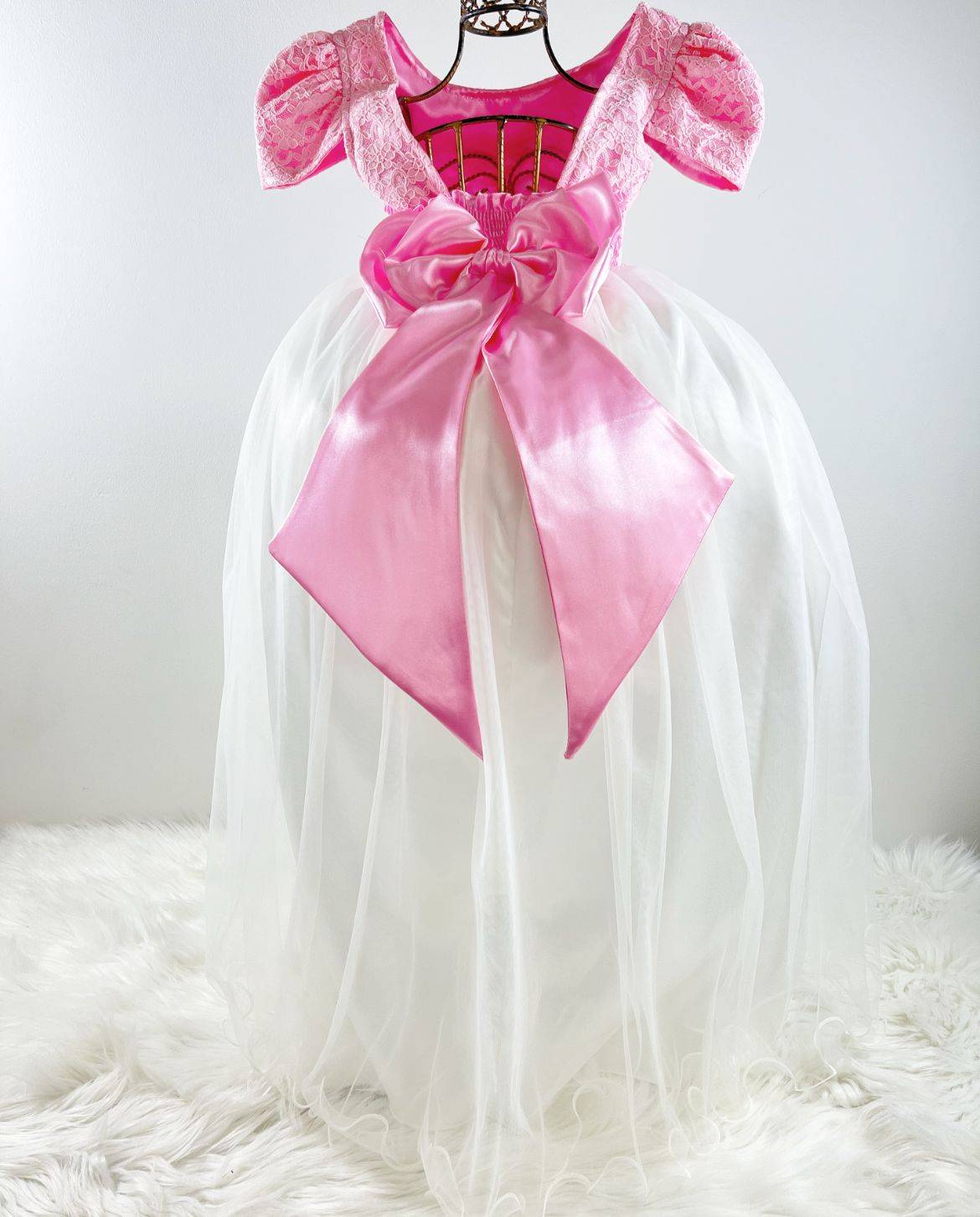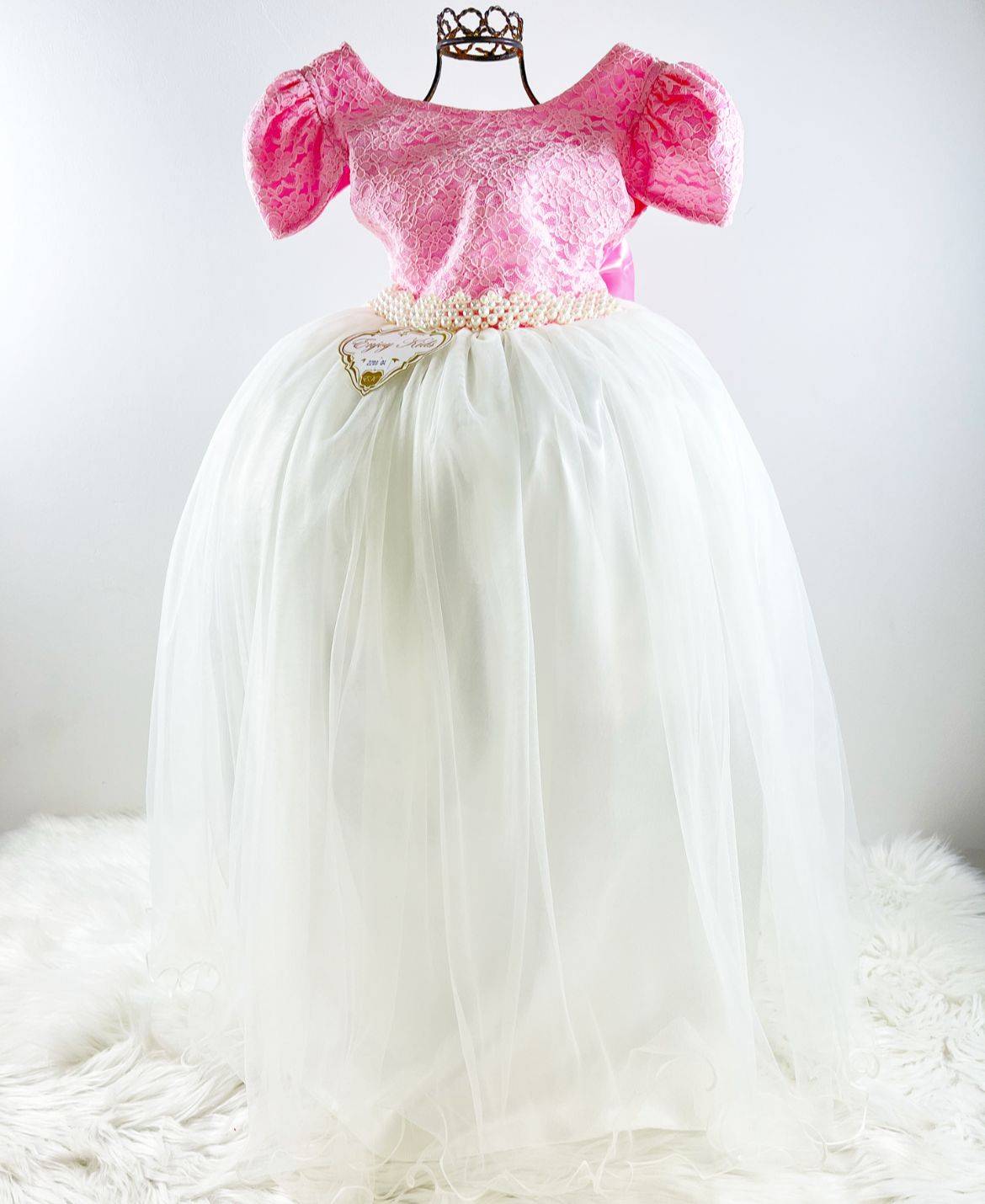 Vestido manga curta infantil festa, cetim com renda, Cintura com cintinho de pérolas sintéticas, saia lisa off white tule, com. Elástico nas costas ajustável ao corpo e laço.