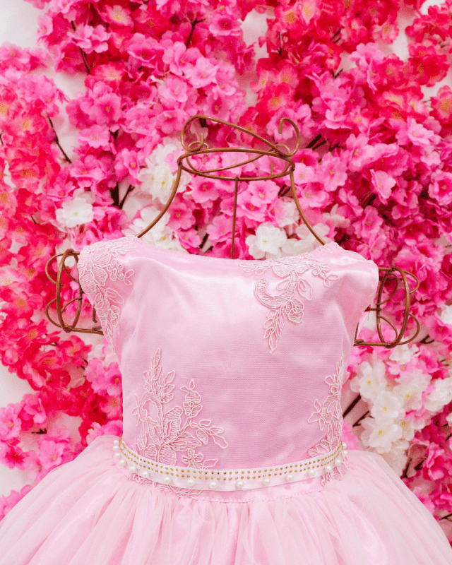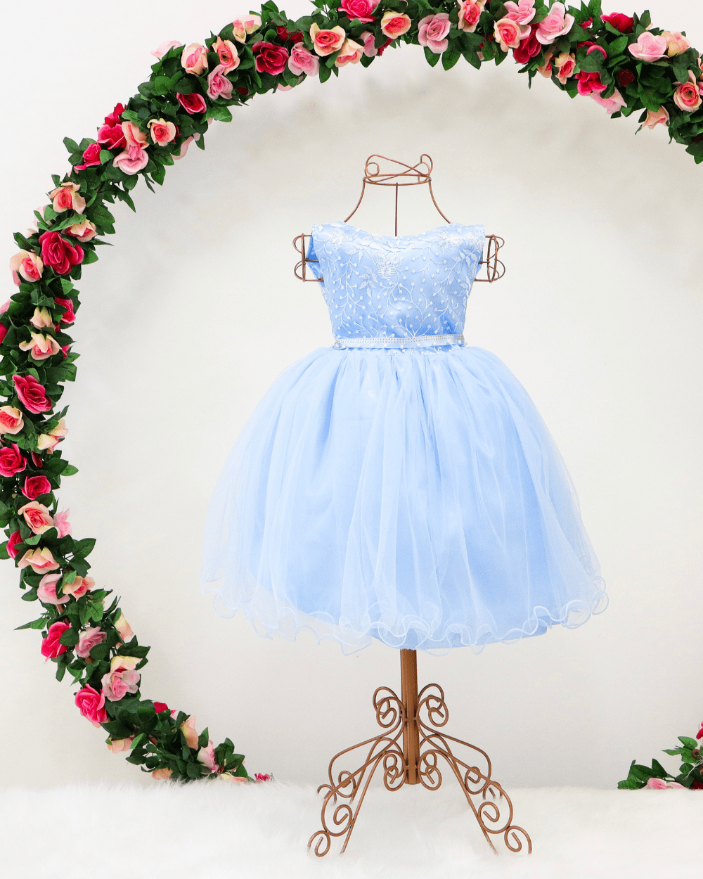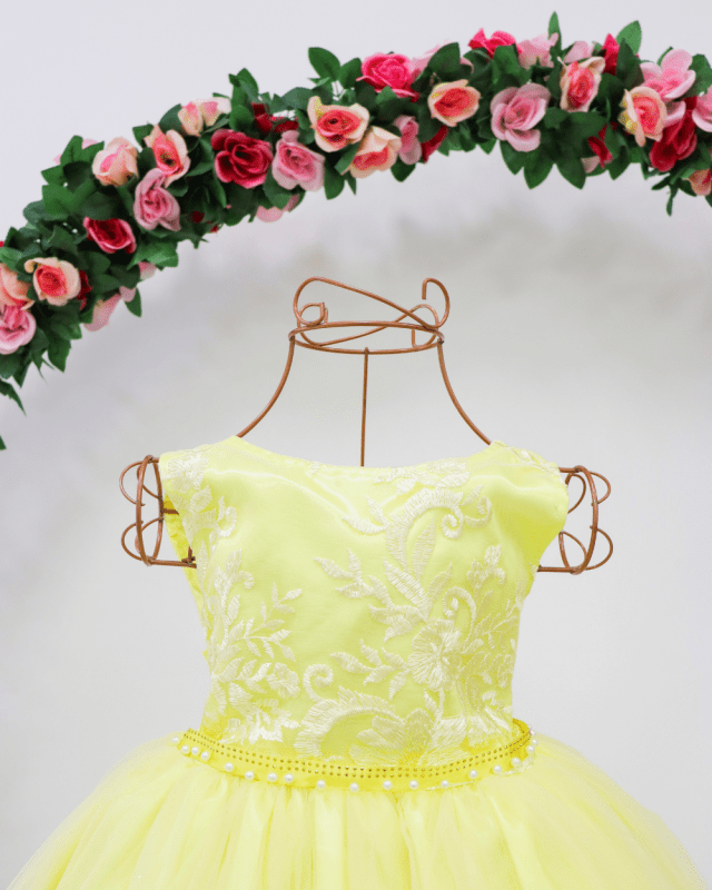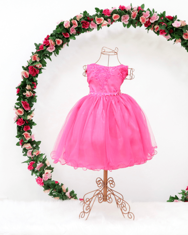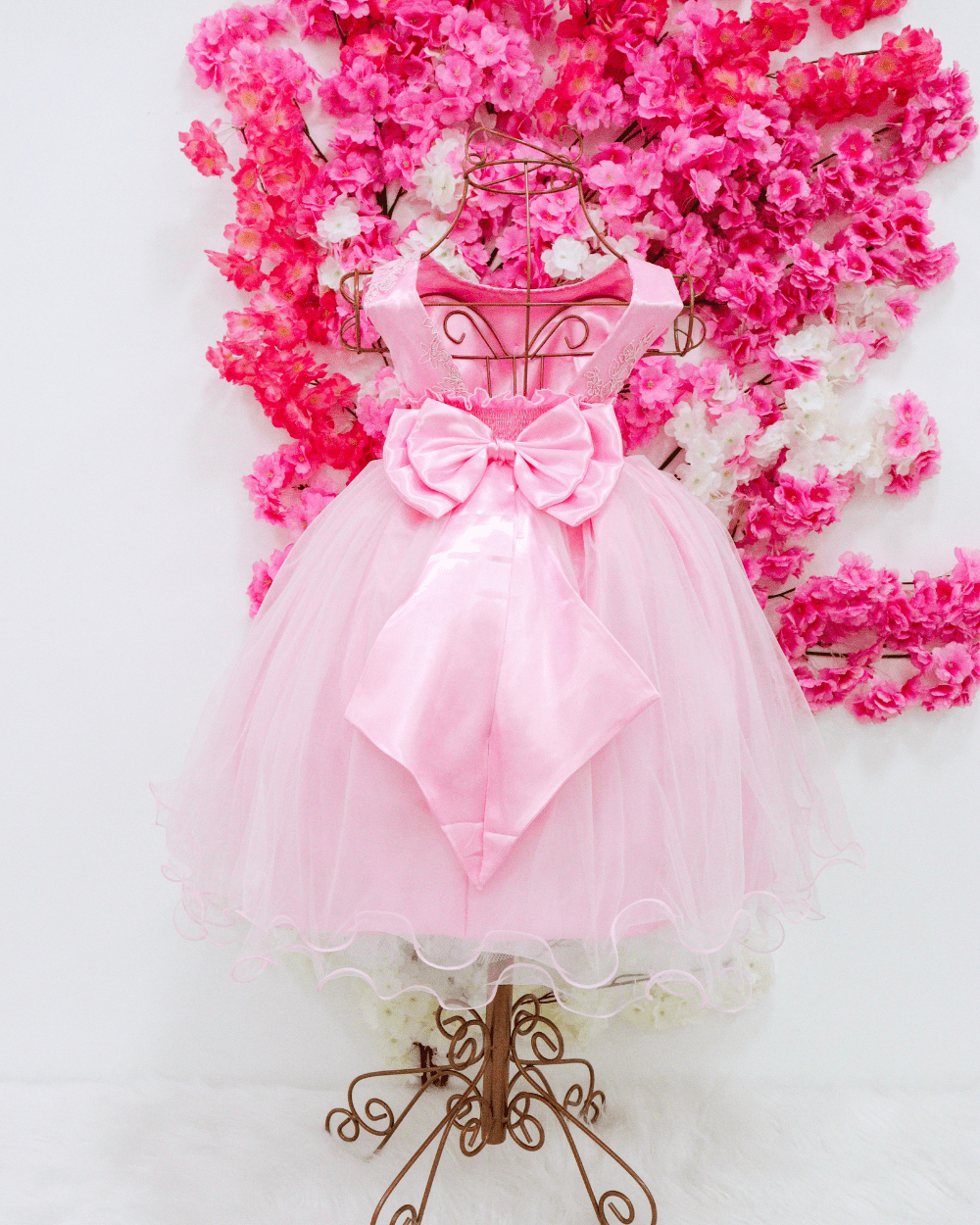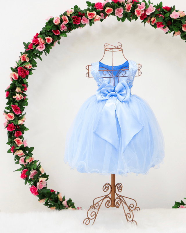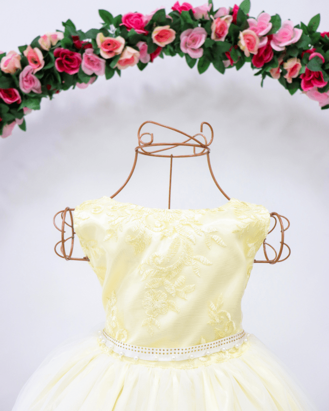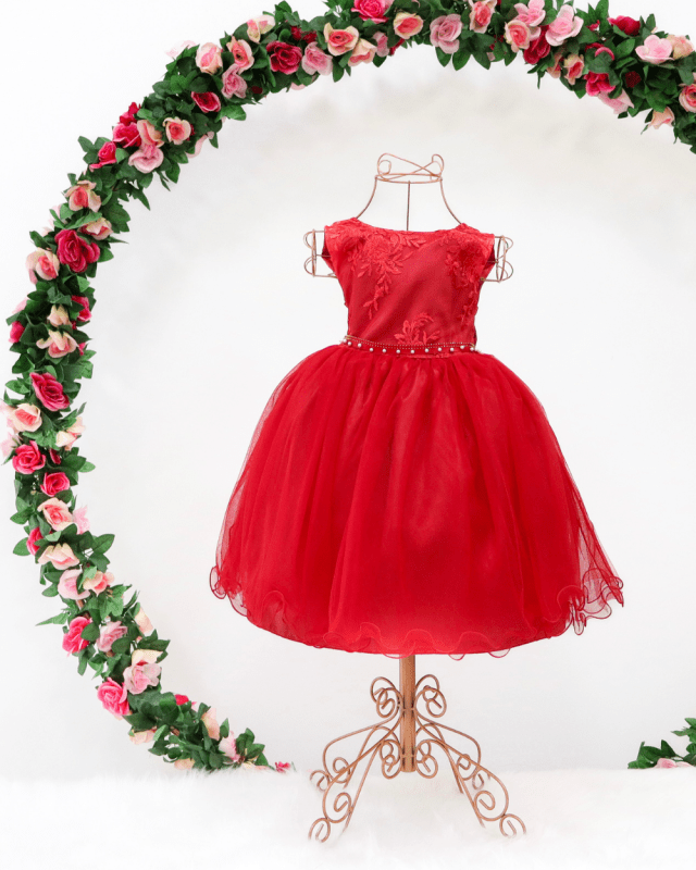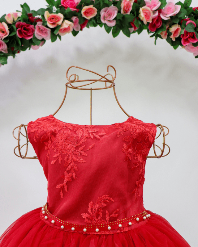 Vestido infantil regata peito renda (sortida de acordo com a disponibilidade em estoque). Saia tule voal. Cintura com faixa com aplicação de strass e pérolas sintéticas. Elástico nas costas ajustável ao corpo e laço.
