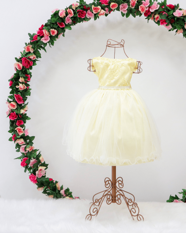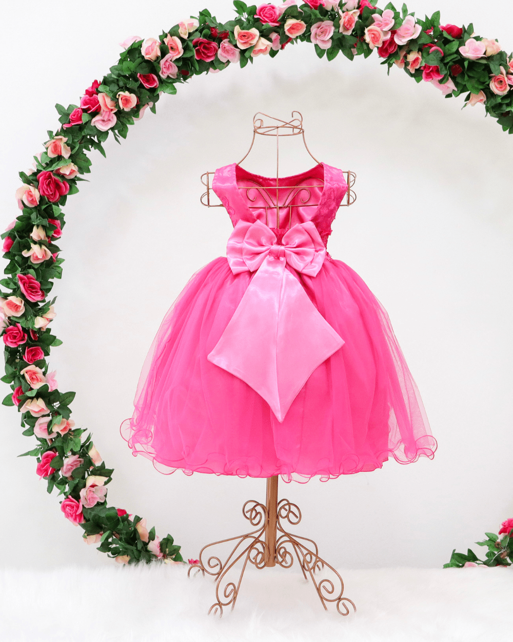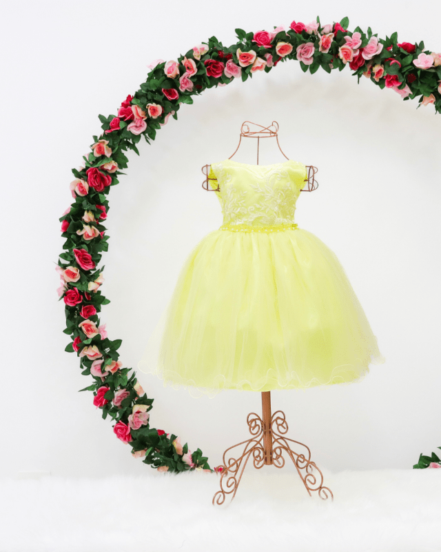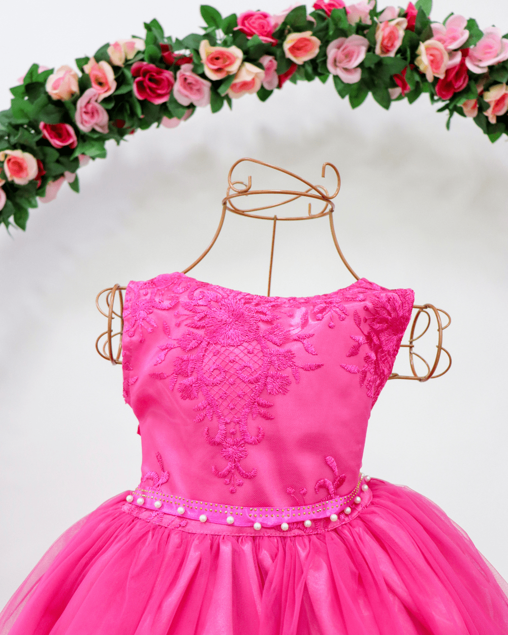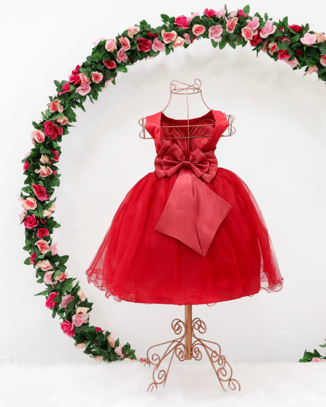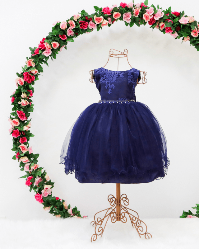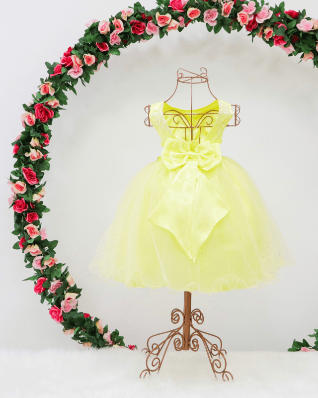 Vestido infantil regata peito renda (sortida de acordo com a disponibilidade em estoque). Saia tule voal. Cintura com faixa com aplicação de strass e pérolas sintéticas. Elástico nas costas ajustável ao corpo e laço.