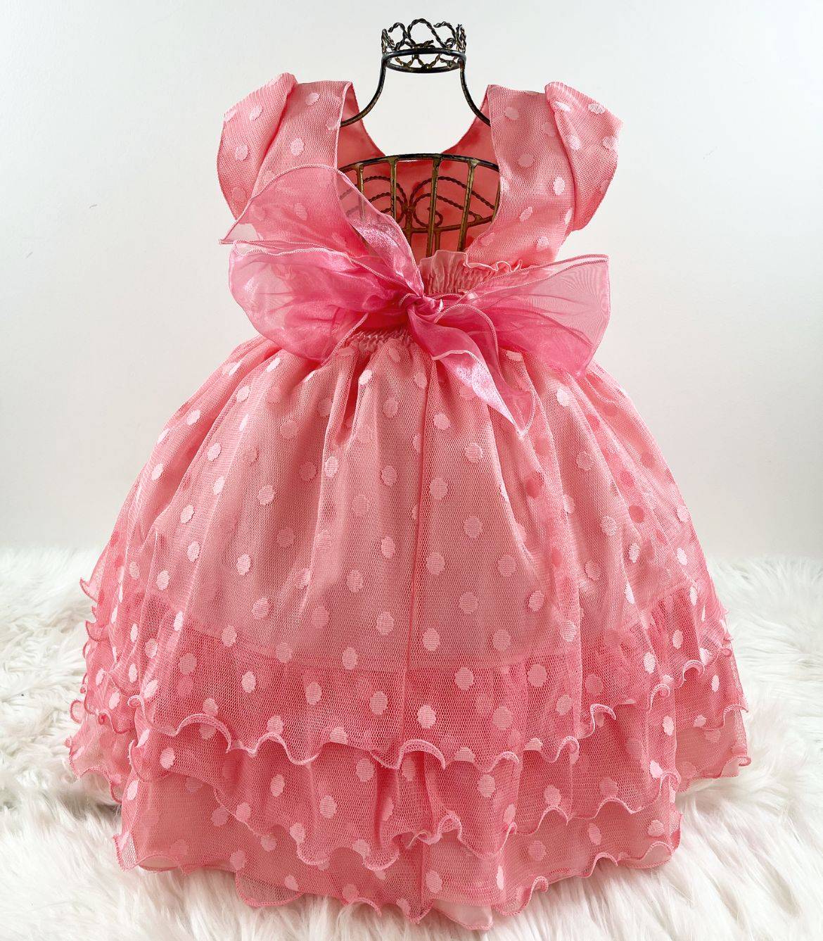 VESTIDO MANGA CURTA COM FORRO, TULE COM BOLAS, CINTURA COM PÉROLAS SINTÉTICAS, LAÇO NAS COSTAS AJUSTÁVEL AO CORPO E LAÇO.