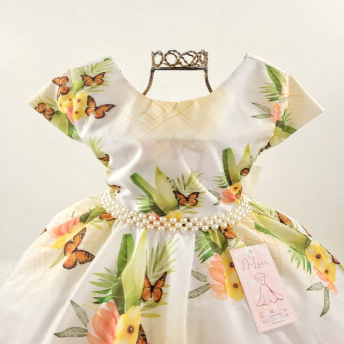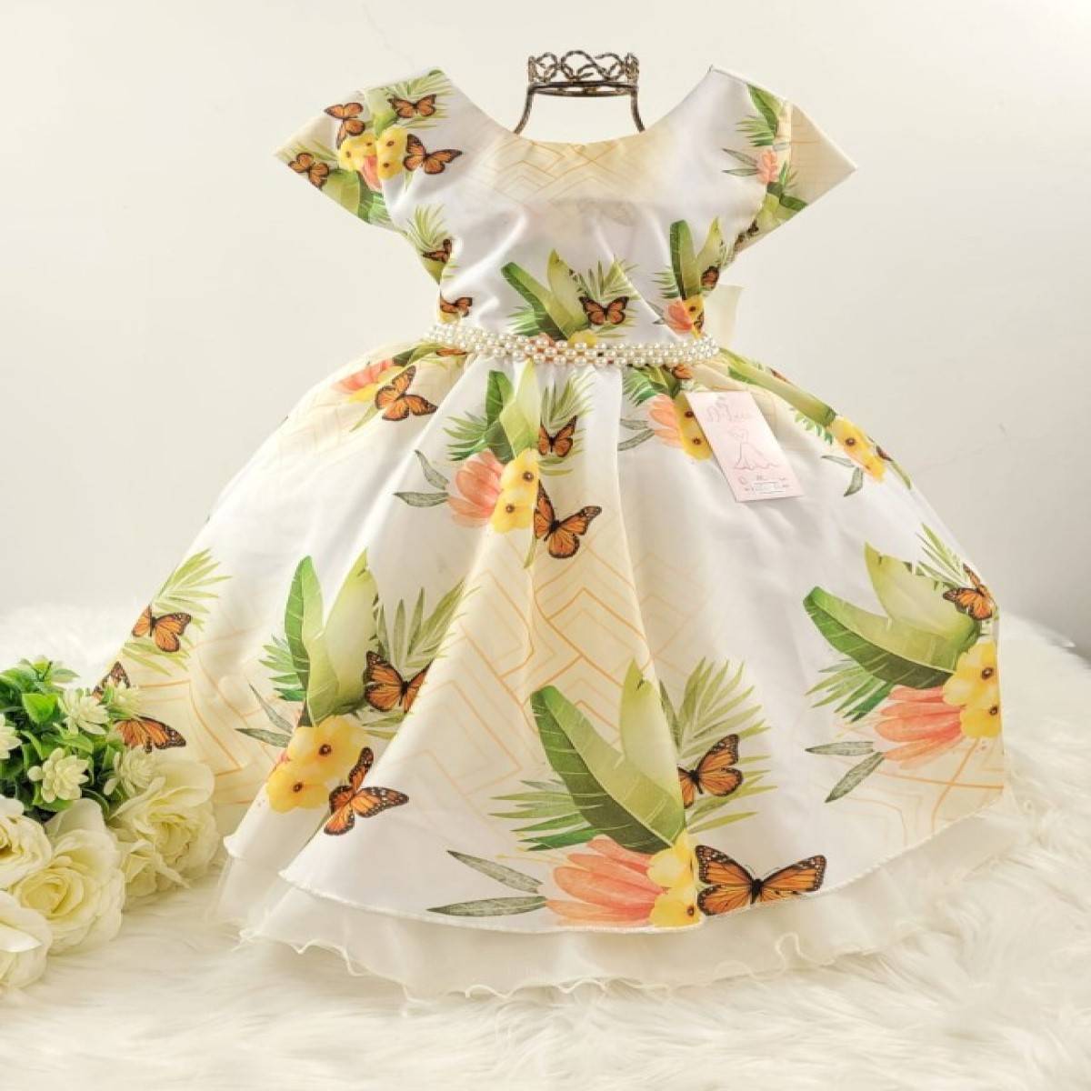 Vestido infantil manga curta estampado floral e borboletas, saia acabamento simples.Cintura com pérolas sintéticas. Elástico nas costas ajustável ao corpo e laço.