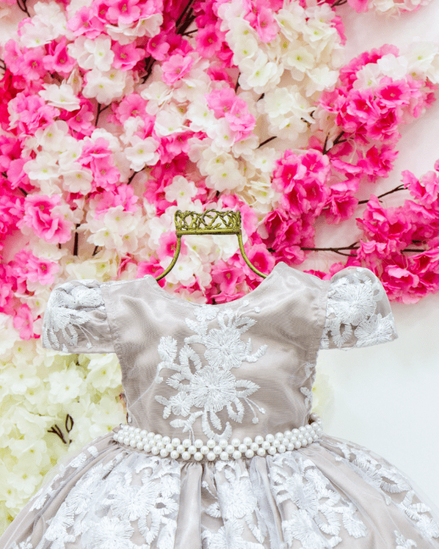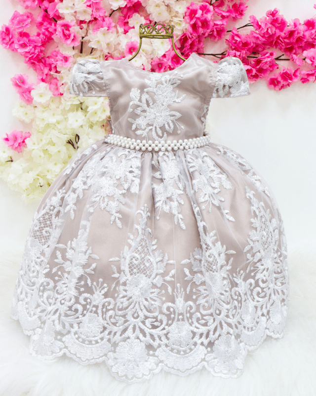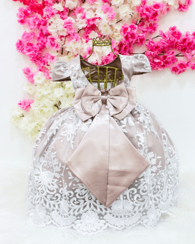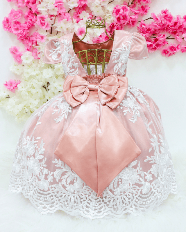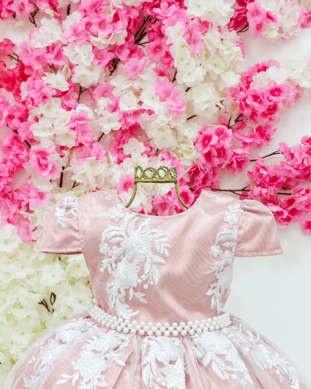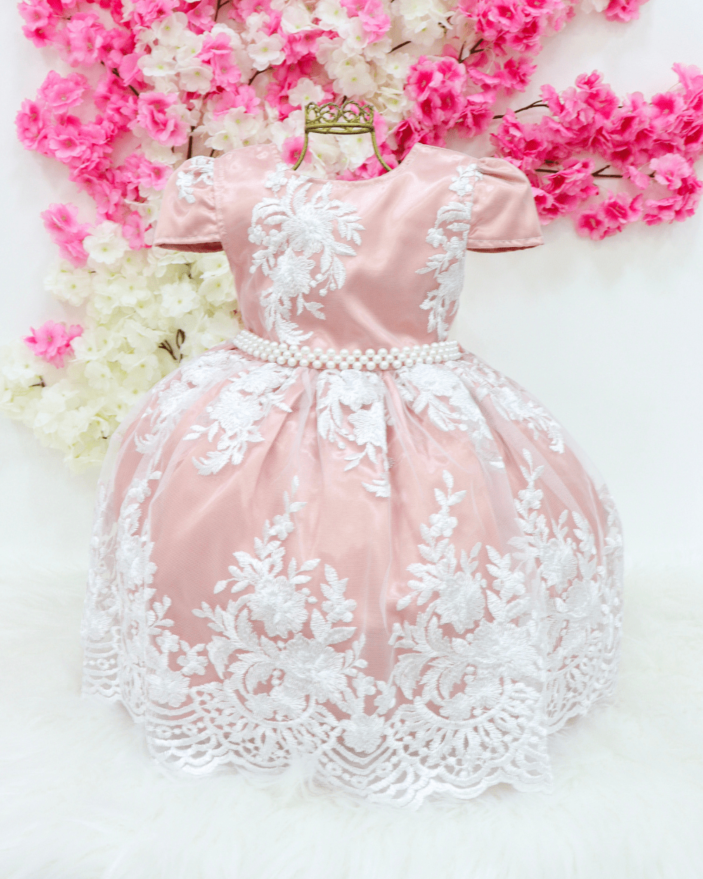 Vestido infantil manga curta realeza renda gripir,cintura cintinho de pérolas sintéticas .Elástico nas costas ajustável ao corpo e laço.