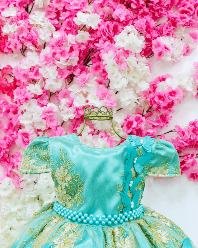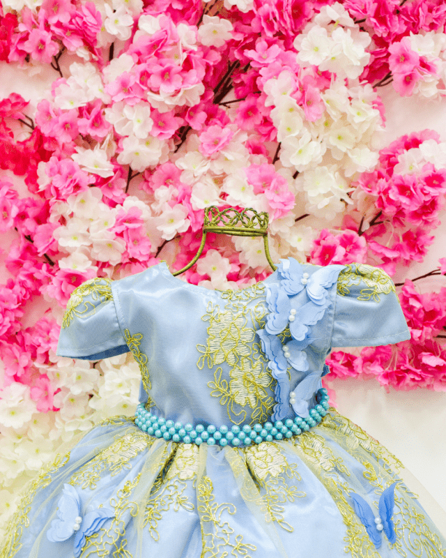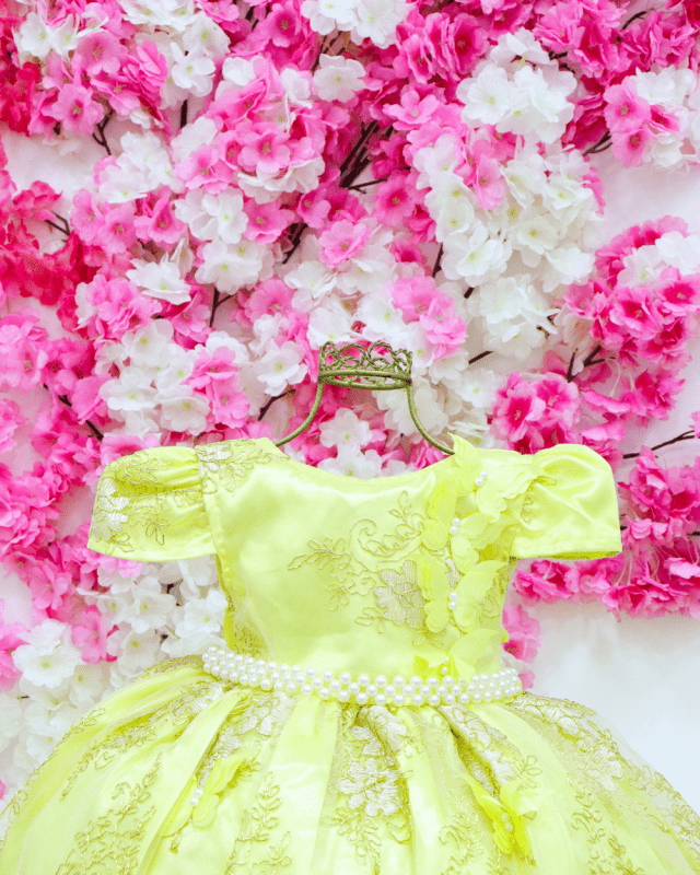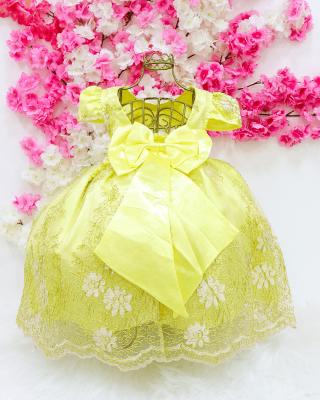 VESTIDO MANGA CURTA COM FORRO, PEITO RENDA BORDADO, SAIA TULE , CINTURA COM PÉROLAS SINTÉTICAS, LAÇO TRASEIRO. ELÁSTICO NAS COSTAS AJUSTÁVEL AO CORPO.
