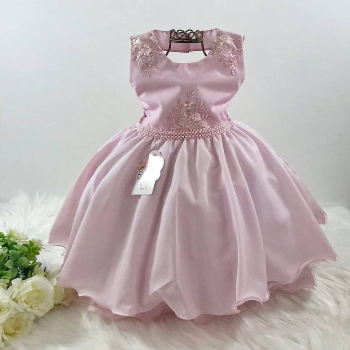 Vestido infantil regata, peito com renda, saia lisa, com babados.Cintura com pérolas sintéticas. Elástico nas costas ajustável ao corpo . Cor: ROSA