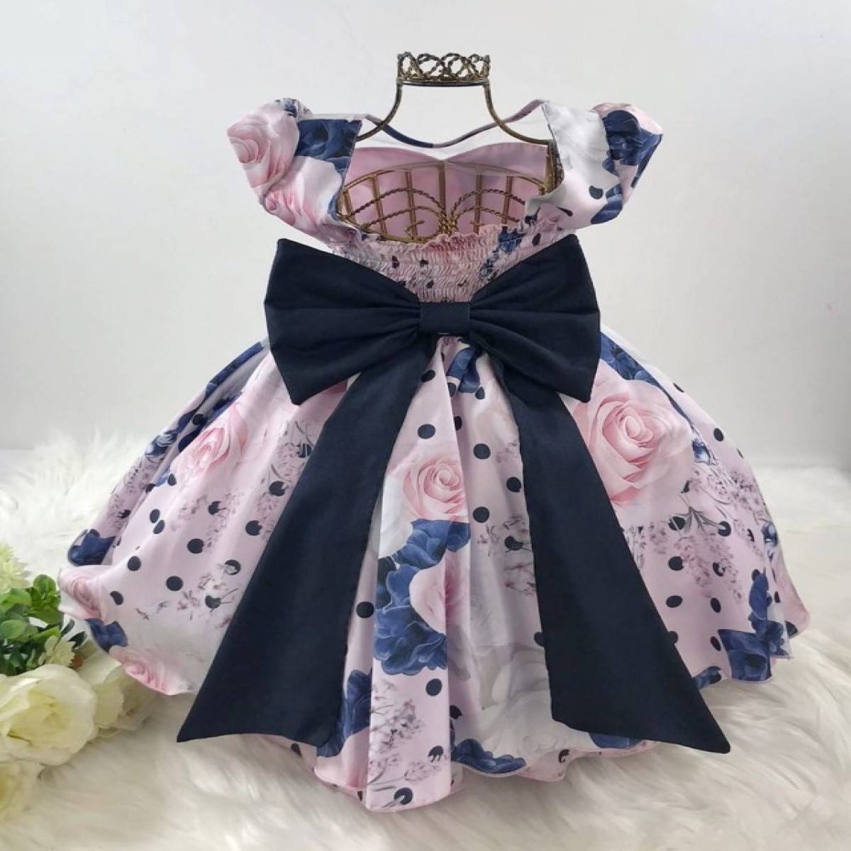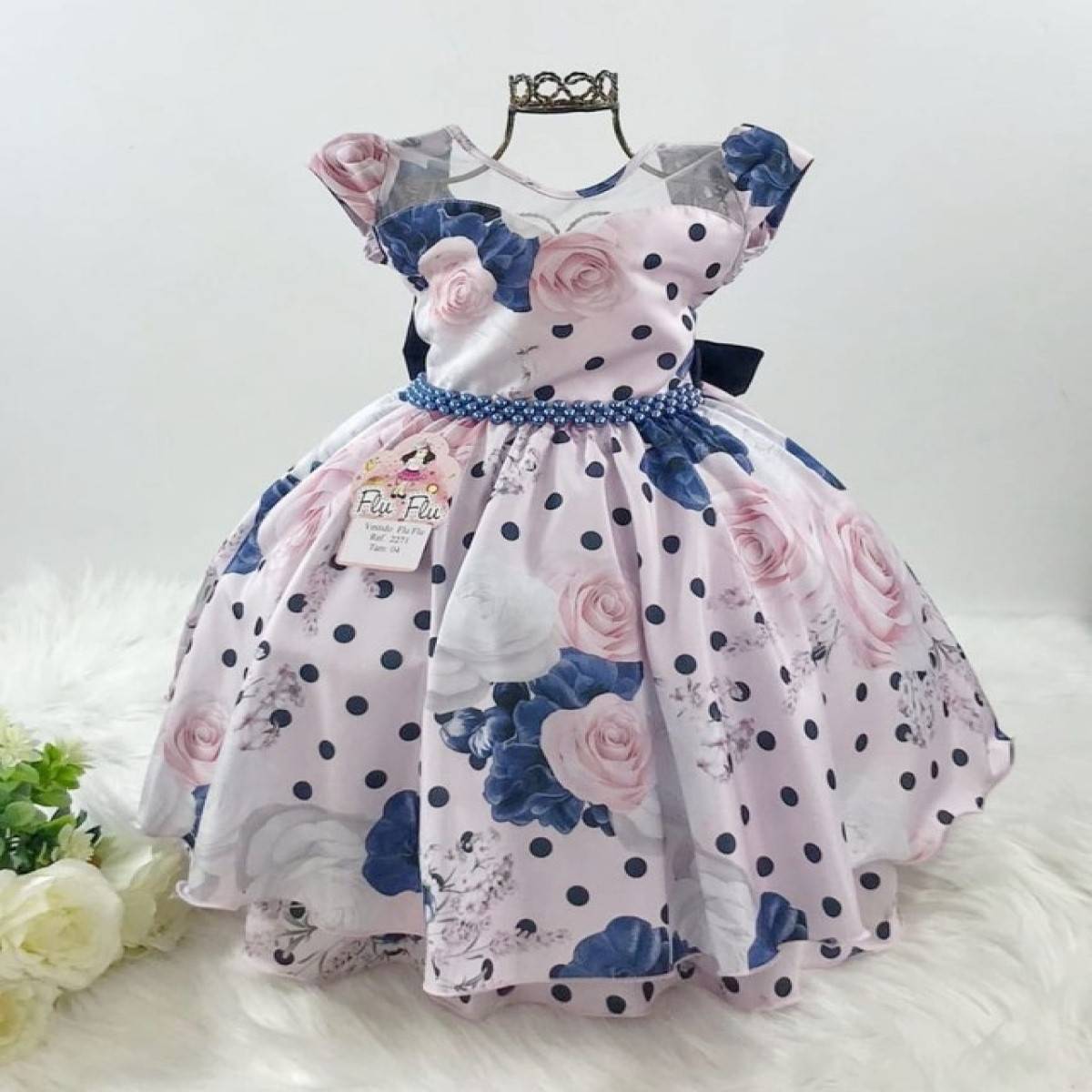 Vestido infantil manga curta, peito com tule transparente,estampa floral e poá, saia com babados.Cintura com pérolas sintéticas. Elástico nas costas ajustável ao corpo e laço.