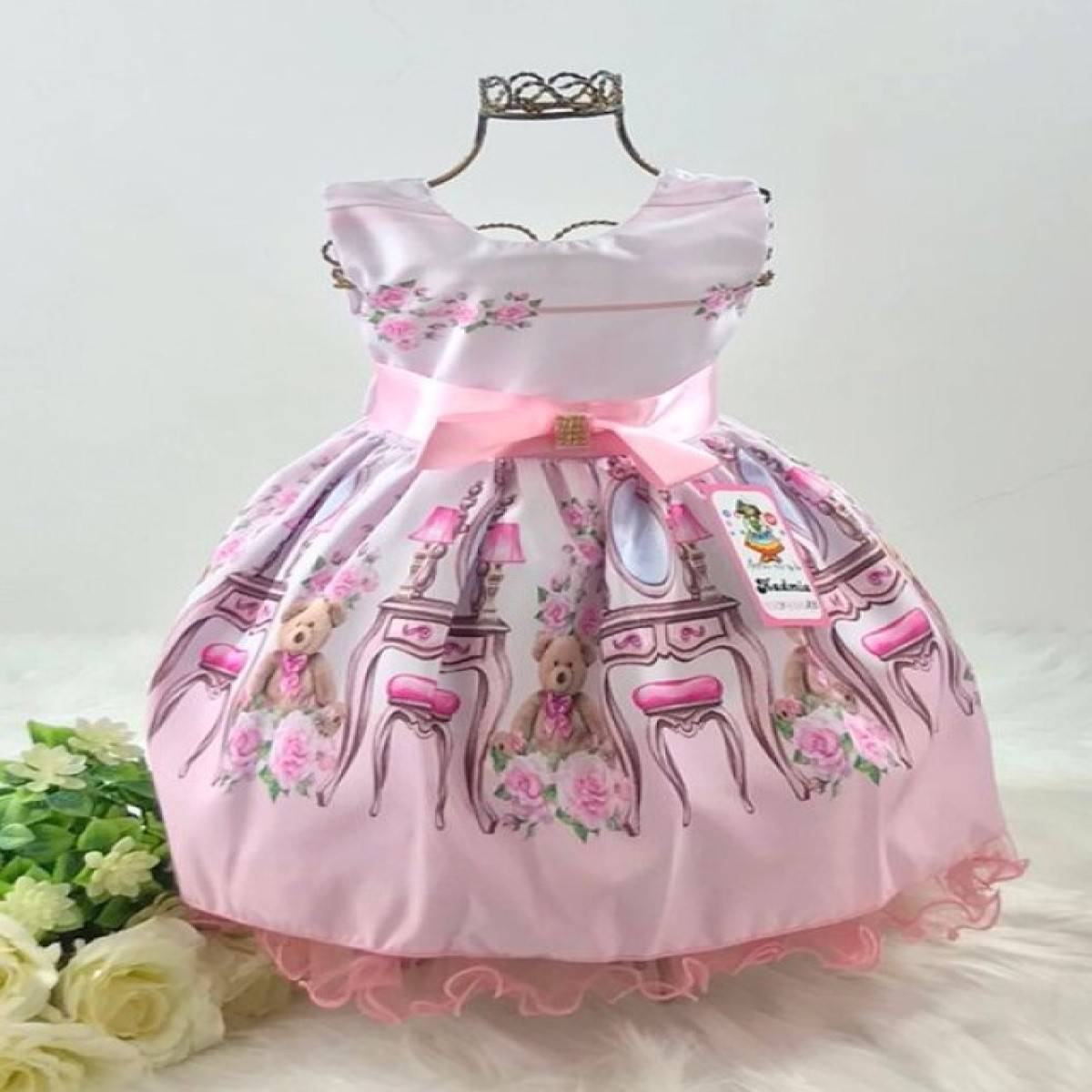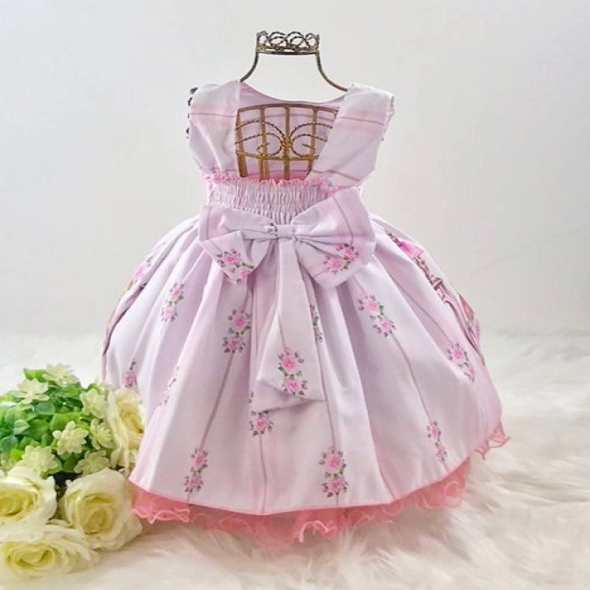 Vestido infantil festa manga curta, estampa floral , cintura com faixa, saia com acabamento na barra babados.Elástico nas costas ajustável ao corpo.