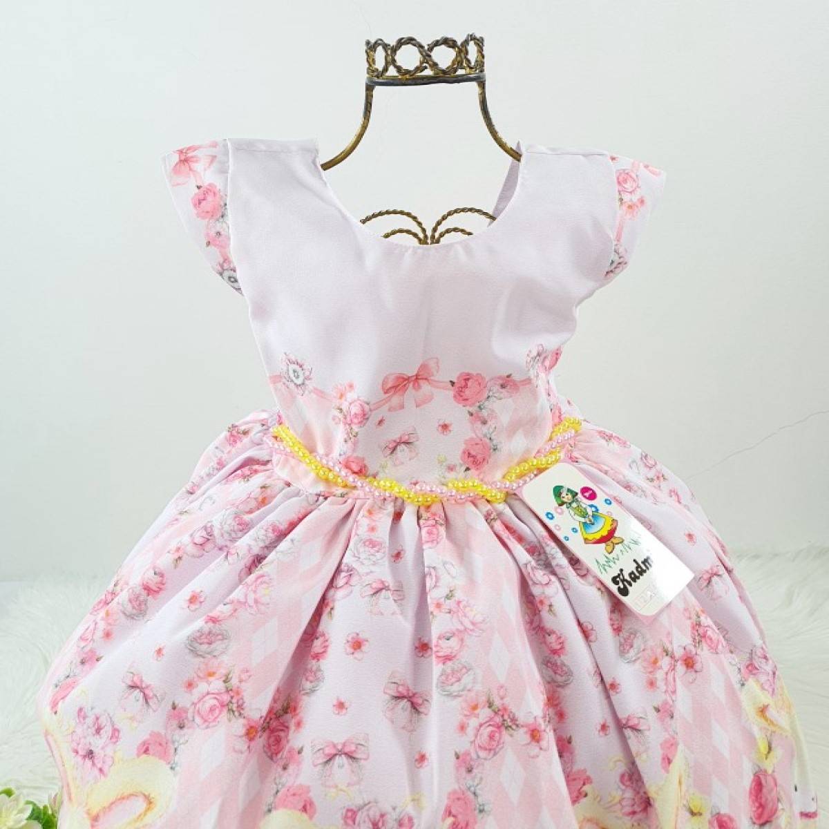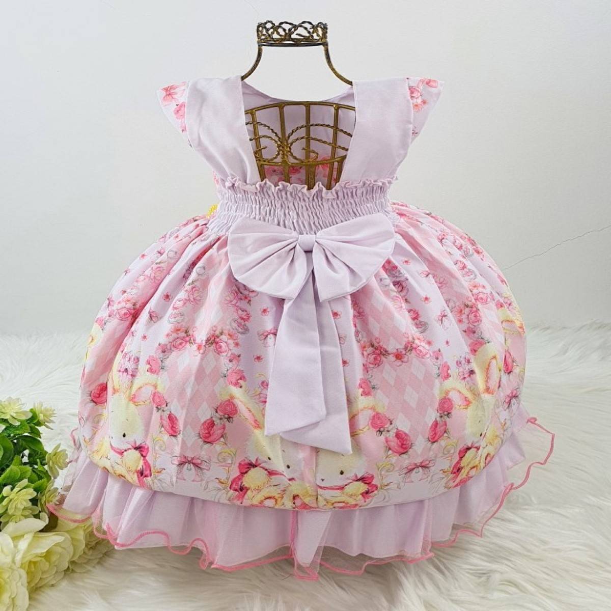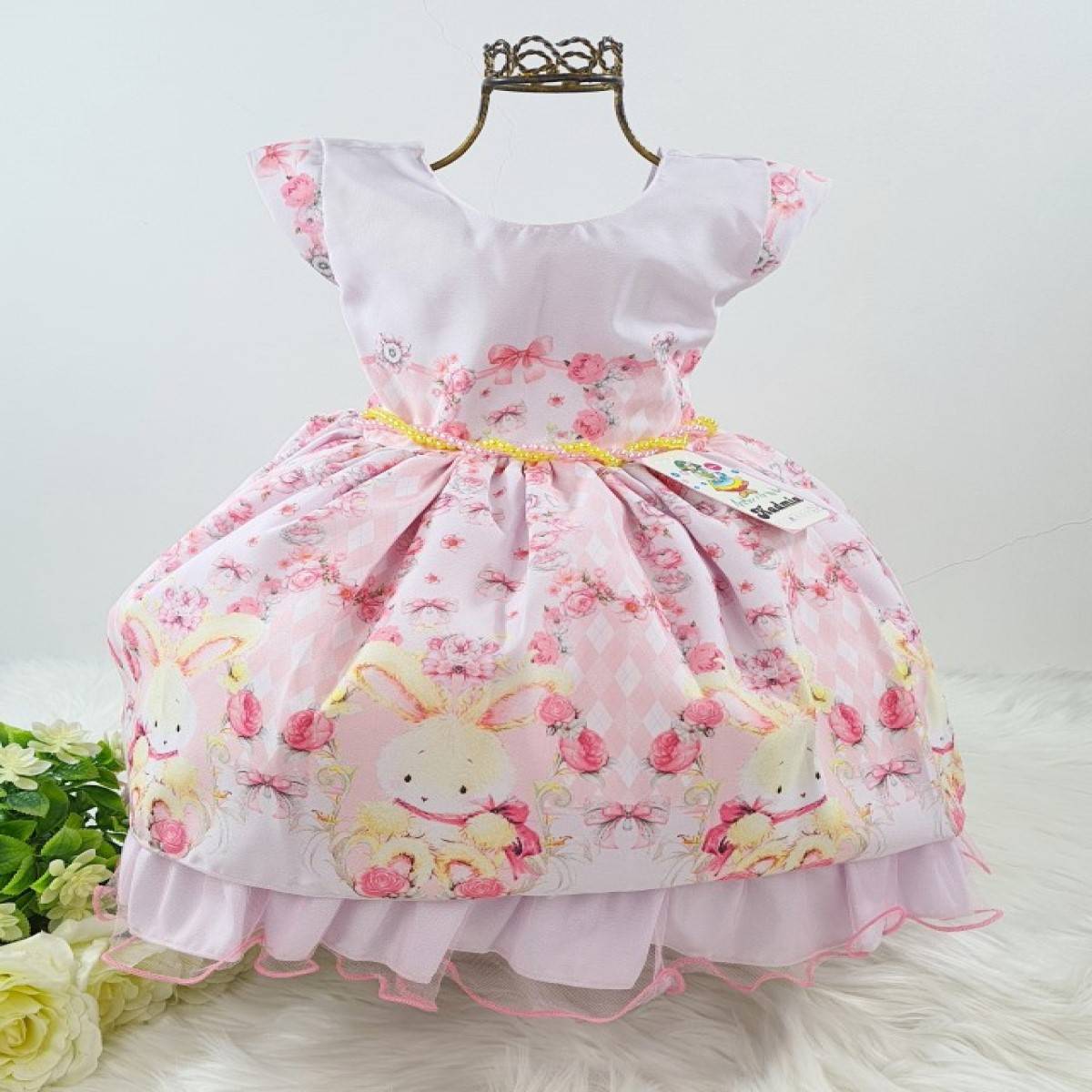 Vestido infantil festa manga curta, estampa floral e coelhos , cintura com pérolas sintéticas, saia com acabamento na barra babados.Elástico nas costas ajustável ao corpo e laço.