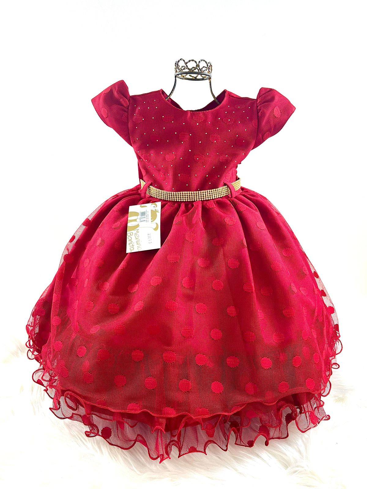 Vestido infantil manga curta, peito com strass, corpo tule bolas, saia acabamento babado . Cintura com passante com para cintinho de strass. Nas costas contém elástico ajustável ao corpo e laço broche.