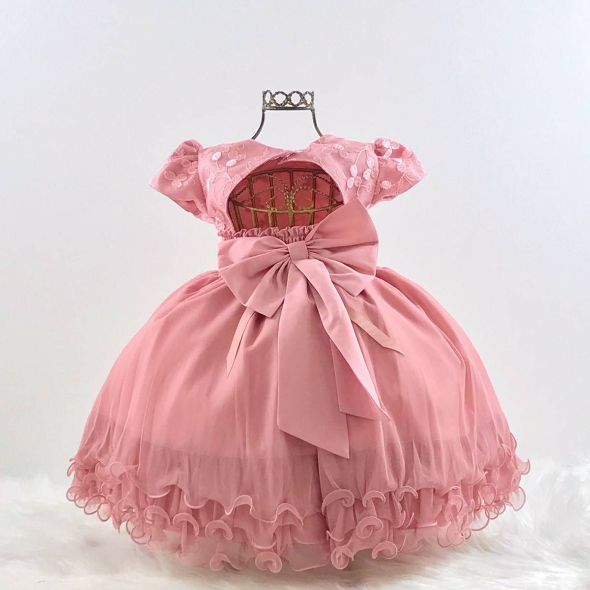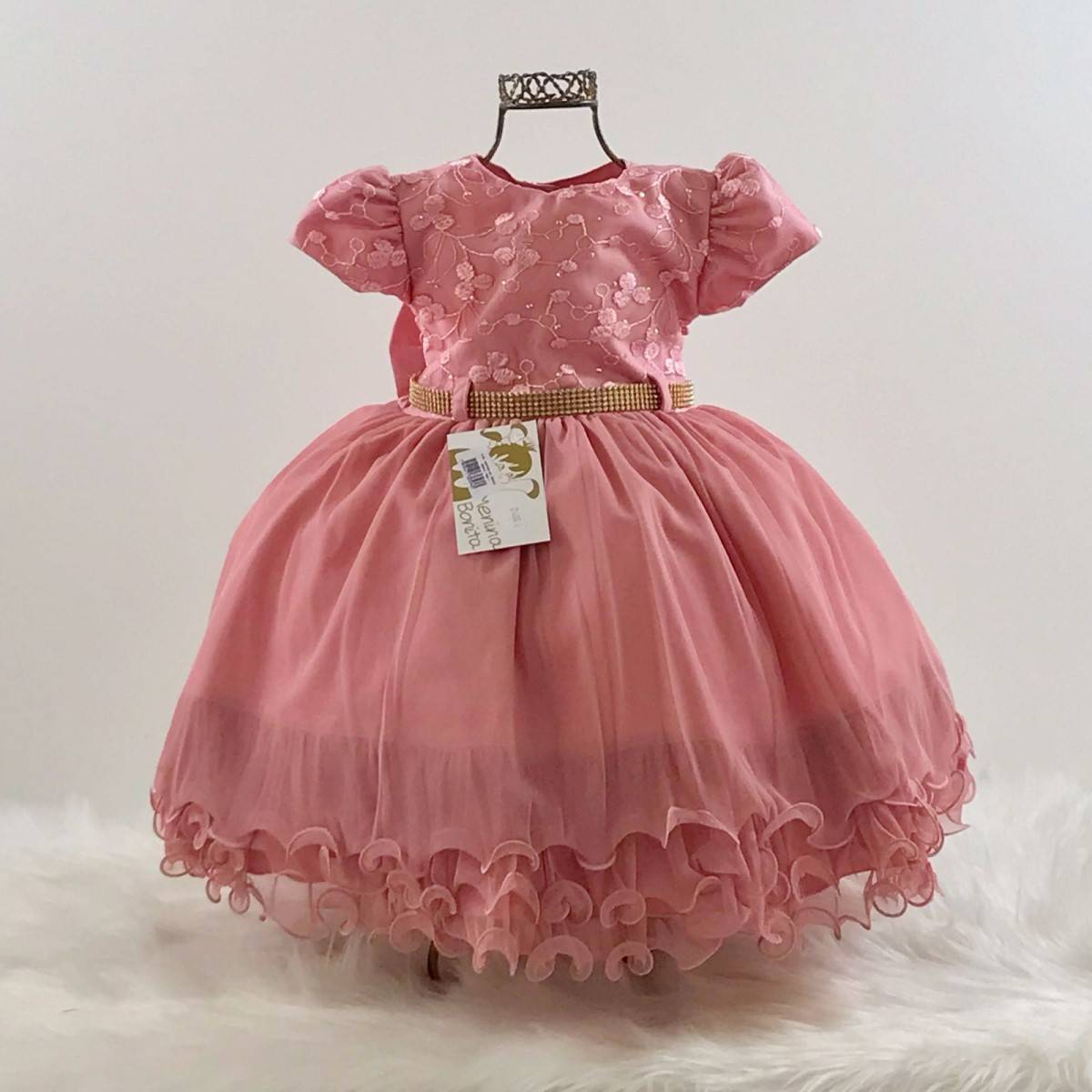 Vestido infantil manga curta , peito bordado com renda e aplicação de strass,liso, cintura com cintinho de strass dourado. Elástico nas costas ajustável ao corpo e laço.