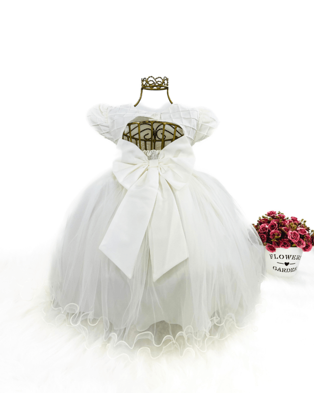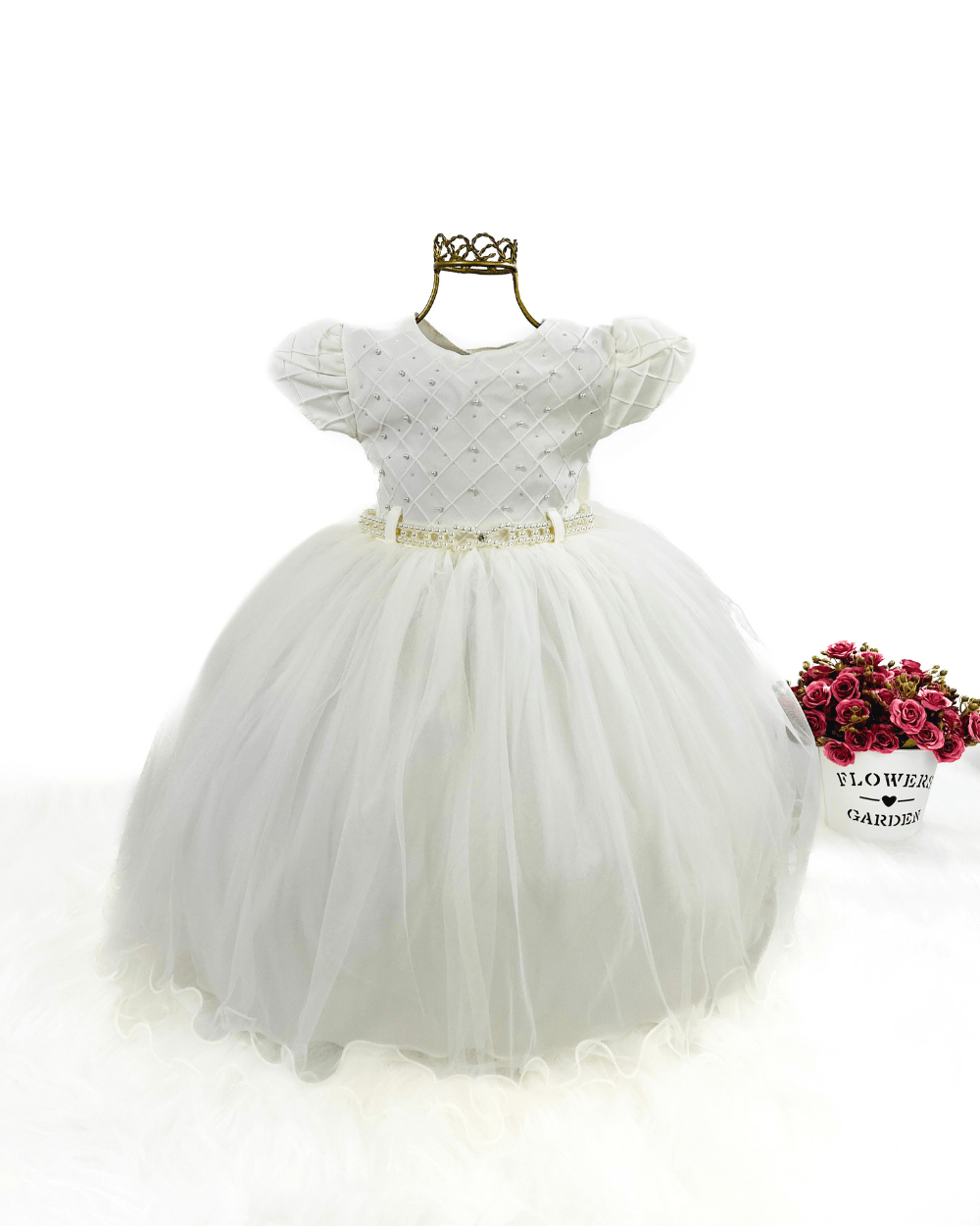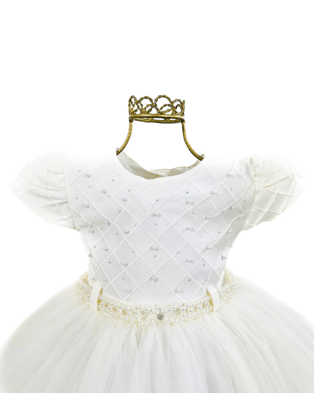 Vestido infantil manga curta, peito nervura bordado com pérolas sintéticas, e strass, saia lisa voal tule. Cintura com passante para cintinho de pérolas sintéticas. Elástico nas costas ajustável ao corpo e laço broche.