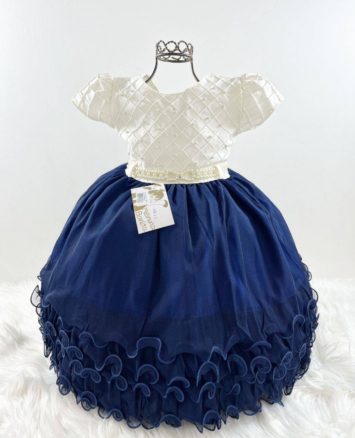 Vestido infantil manga curta, peito quadriculado com pérolas sintéticas, saia lisa voal tule. Cintura com passante para cintinho de pérolas sintéticas. Elástico nas costas ajustável ao corpo e laço broche.