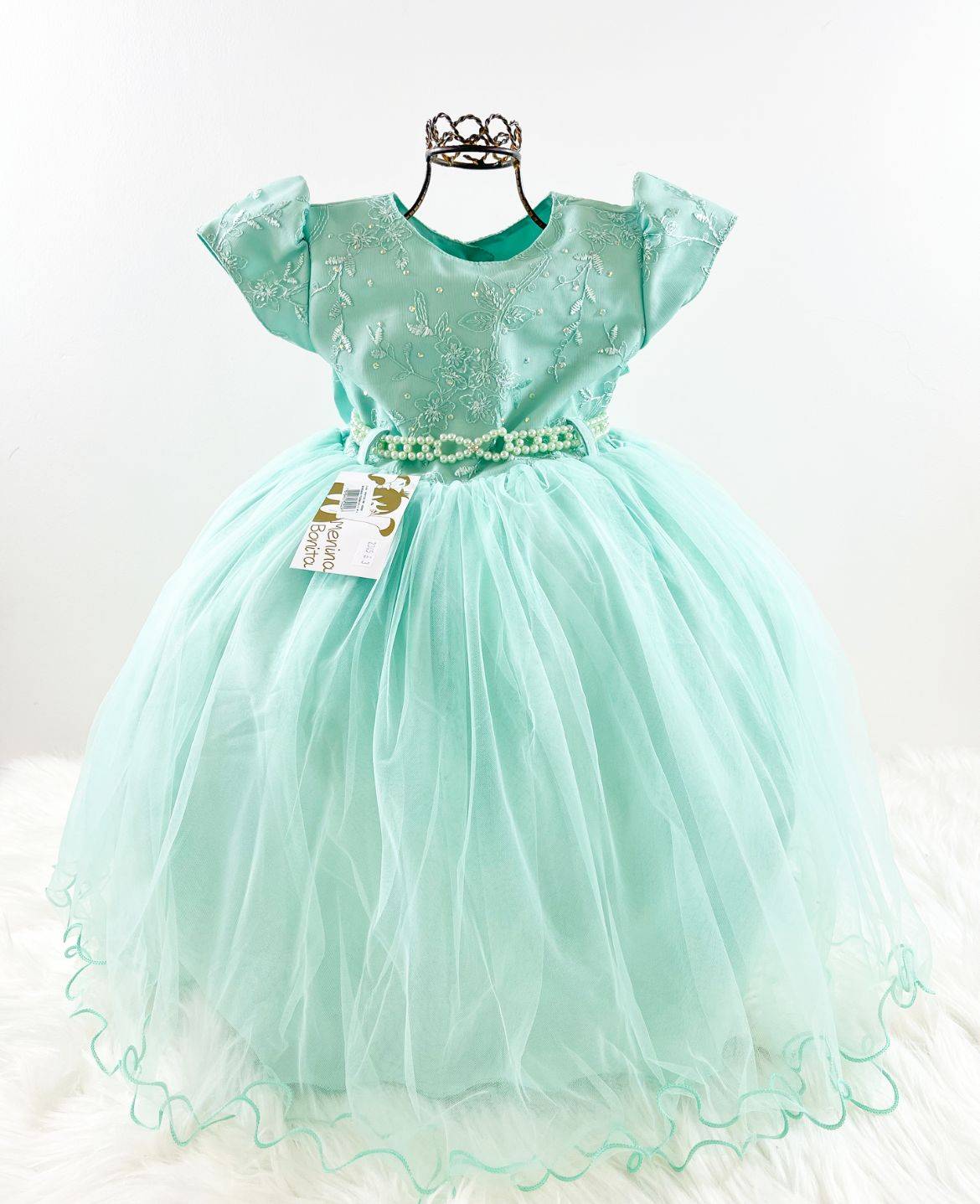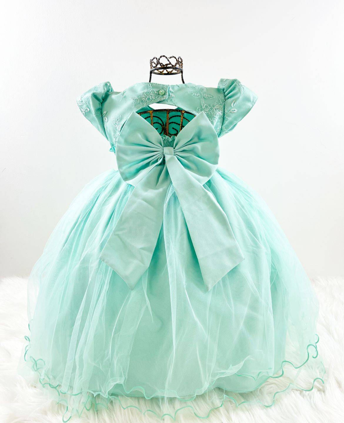 Vestido infantil manga curta, peito bordado com detalhes de strass, saia lisa voal tule. Cintura com passante para cintinho de strass. Elástico nas costas ajustável ao corpo e laço broche.