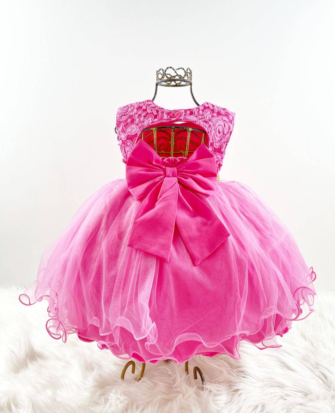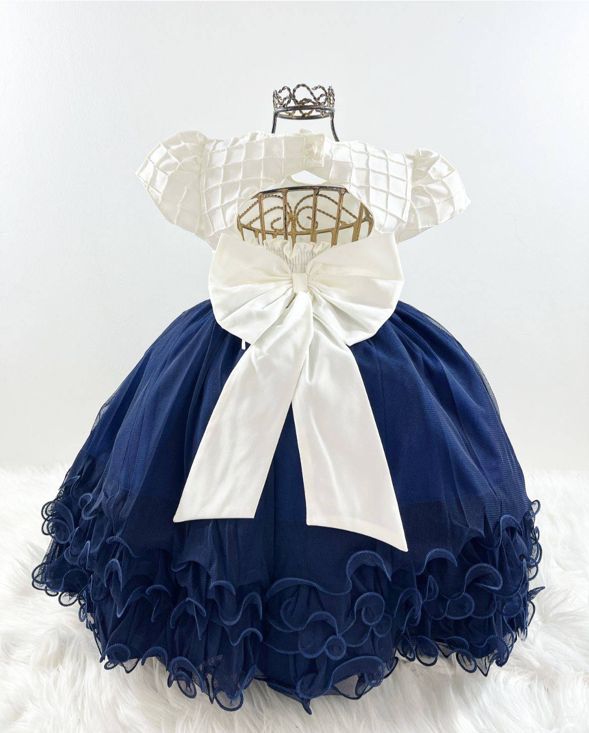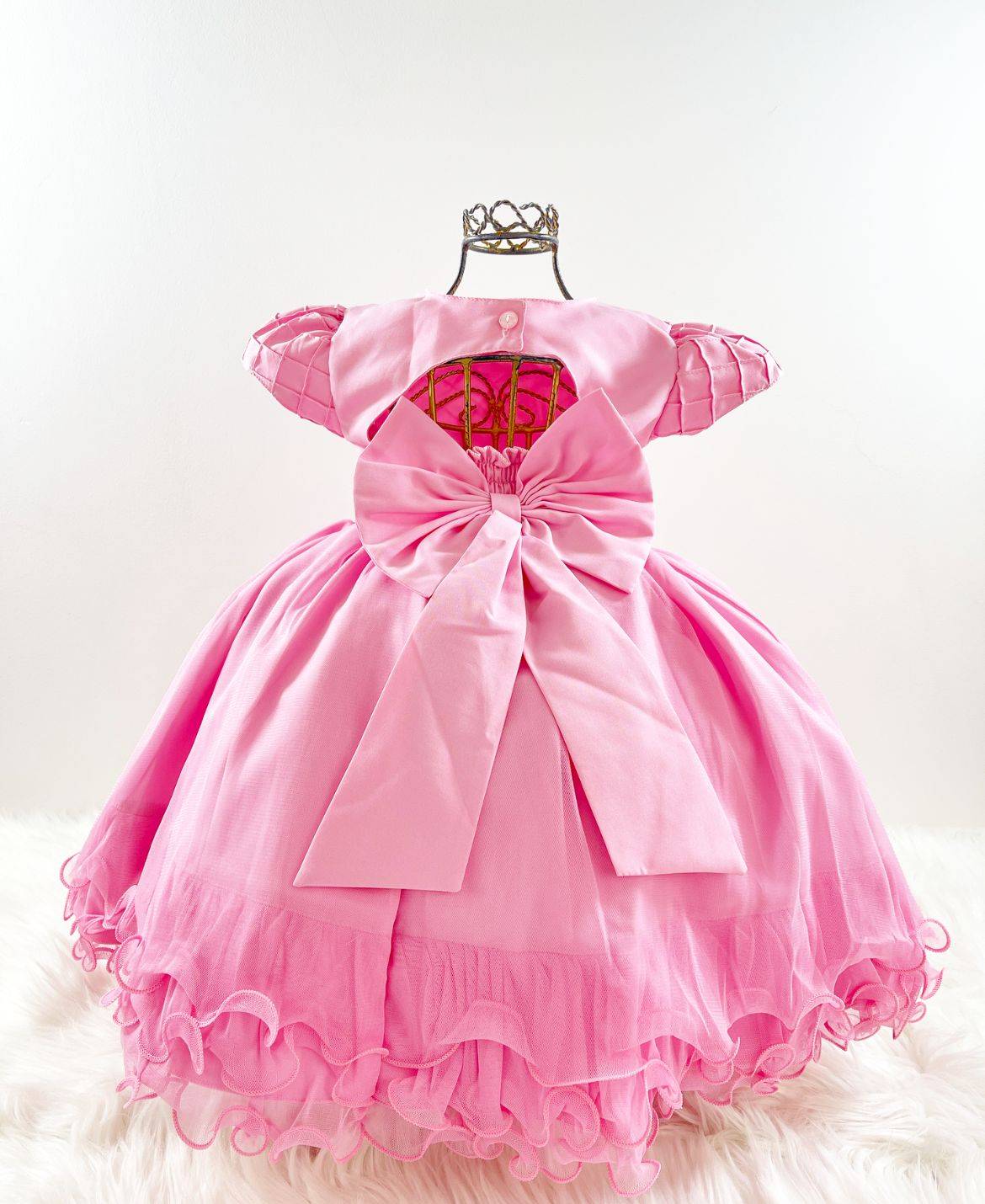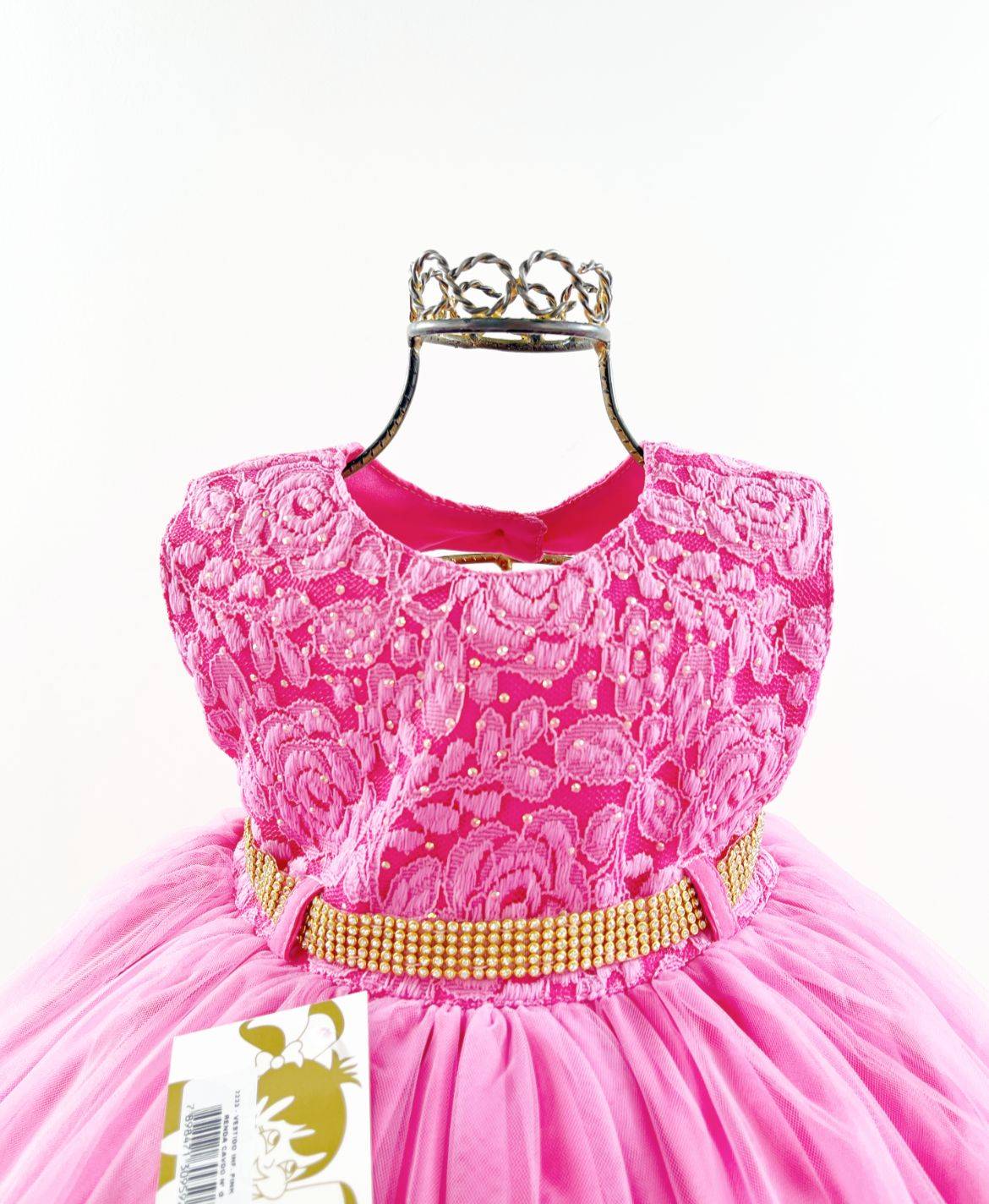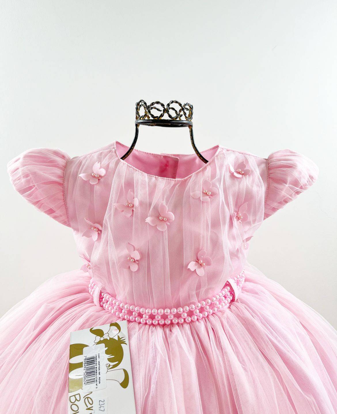 Vestido infantil manga curta, peito com aplique de borboletas, manga com detalhes, saia lisa voal tule. Cintura com passante para cintinho de strass. Elástico nas costas ajustável ao corpo e laço broche.