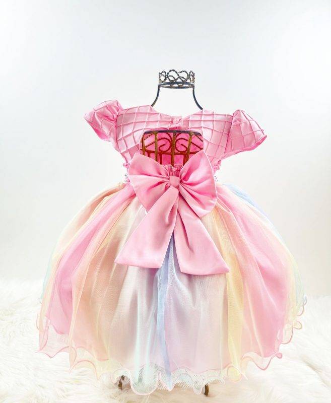 VESTIDO MANGA CURTA COM FORRO, PEITO COM STRASS, SAIA ROSA,COM TULE ARCO IRIS, CINTURA COM PÉROLAS SINTÉTICAS, LAÇO TRASEIRO , ELÁSTICO NAS COSTAS AJUSTÁVEL AO CORPO