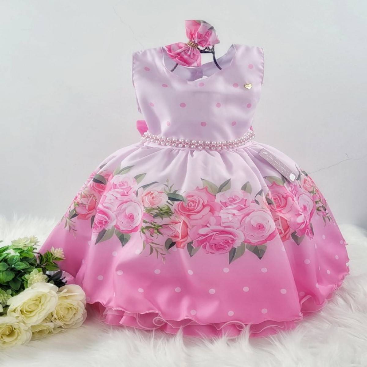 Vestido infantil regata, estampa floral e bolinhas, saia acabamento simples.Cintura com pérolas sintéticas. Elástico nas costas ajustável ao corpo e laço. Acompanha 1 bico de pato.