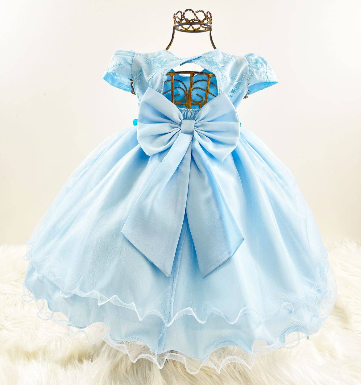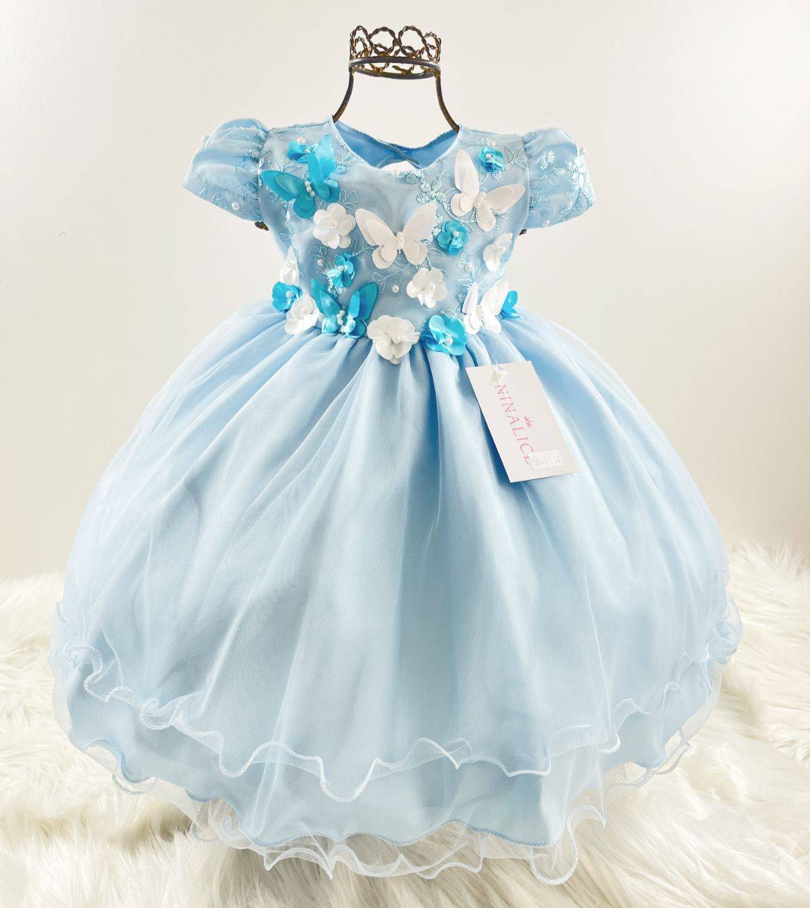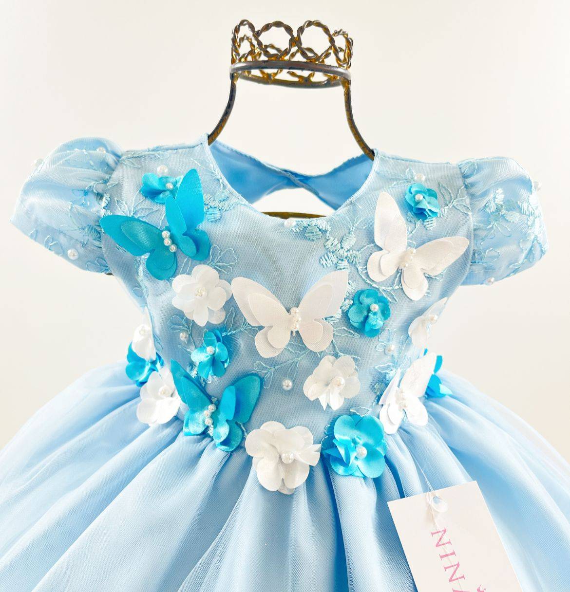 Vestido infantil manga curta com forro,peito com renda e aplicações de borboletas com strass, saia tule.Elástico nas costas ajustável ao corpo e laço.