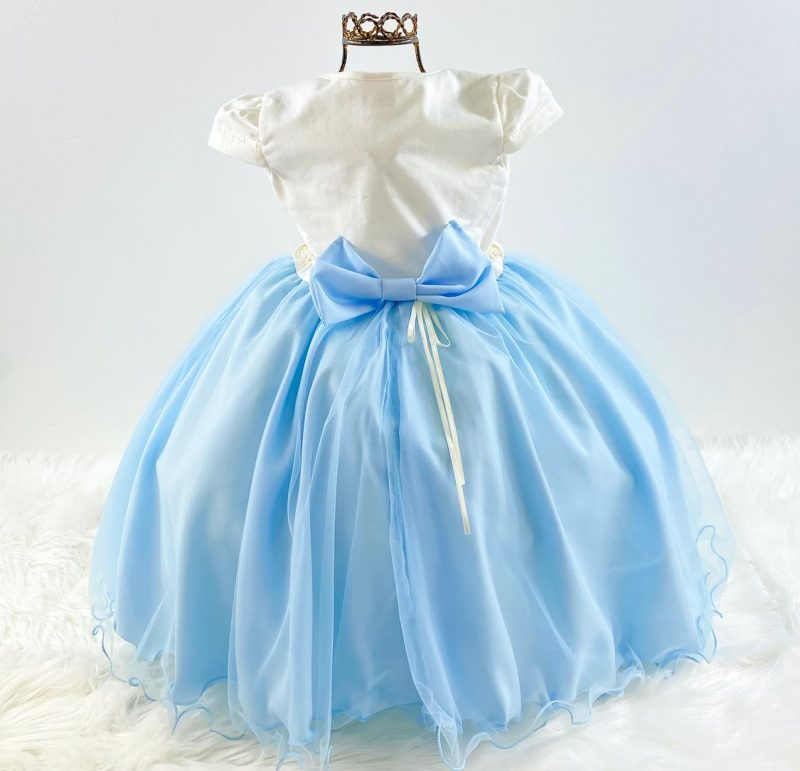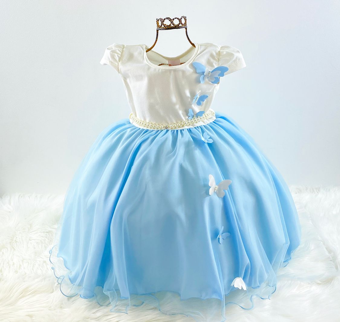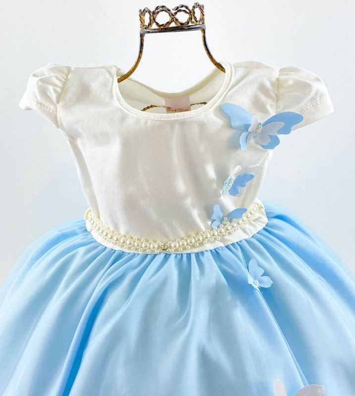 Vestido infantil manga curta , peito liso com aplicação de borboletas com pérolas sintéticas, saia lisa com aplicação de borboletas com pérolas sintéticas, babado tule. Laço nas costas.