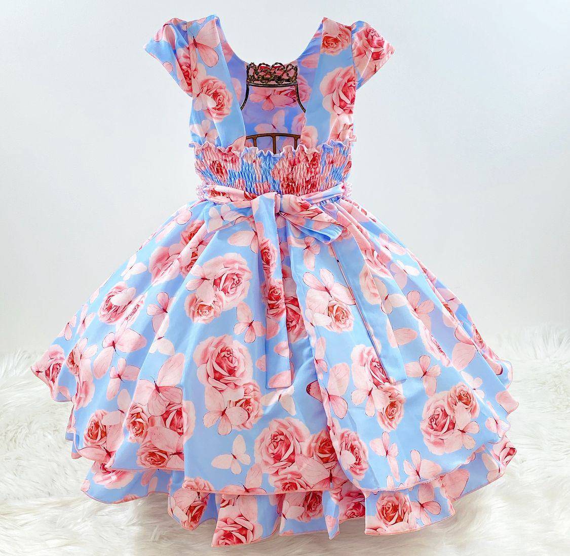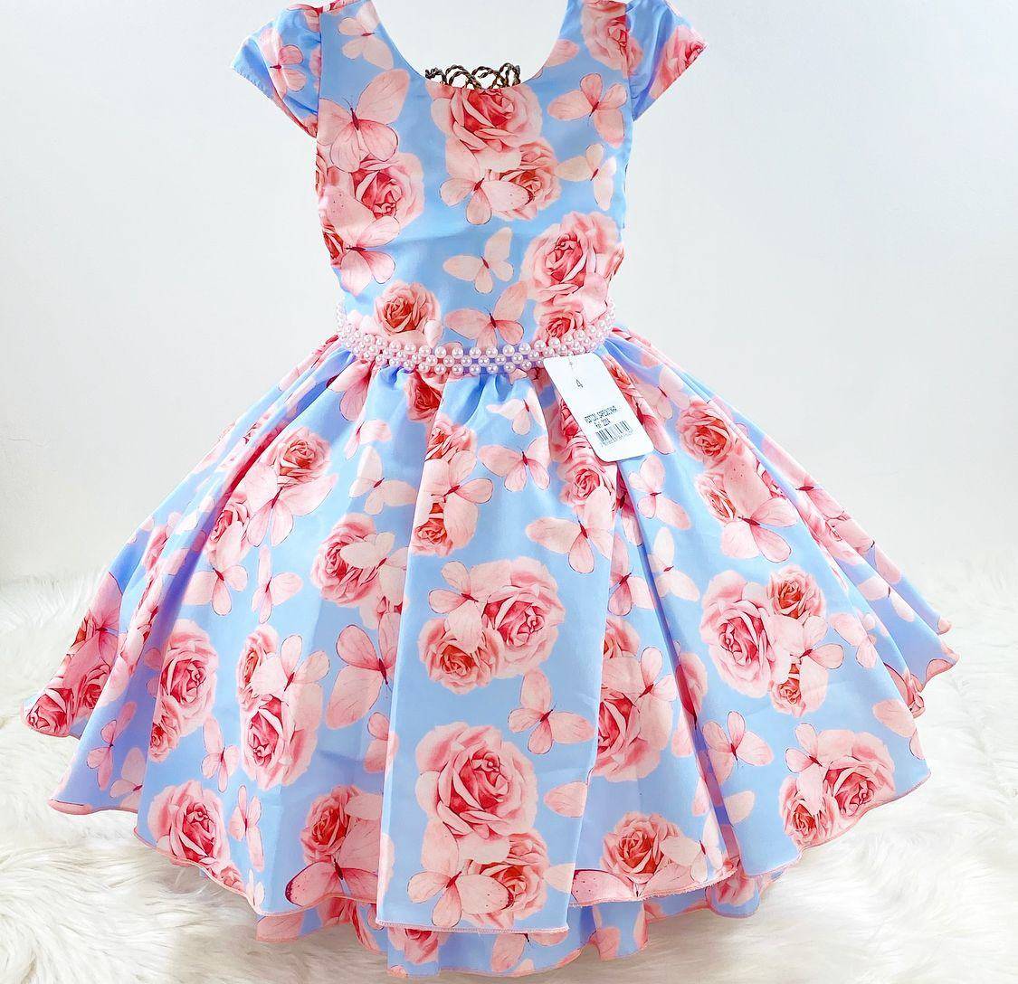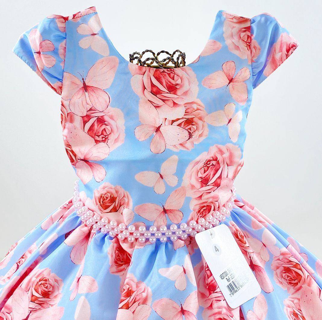 Vestido infantil manga curta, estampa floral.Cintura com cintinho de pérolas sintéticas . Elástico nas costas ajustável ao corpo e faixa.