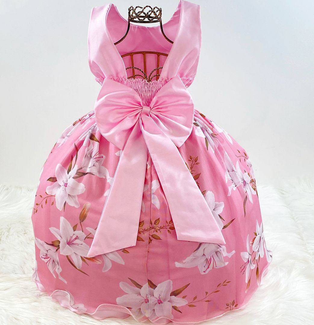 VESTIDO REGATA ESTAMPADO COM TULE ROSA, CINTO DE PÉROLAS SINTÉTICAS, COM ELÁSTICO NAS COSTAS AJUSTÁVEL AO CORPO.