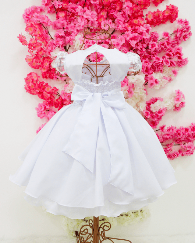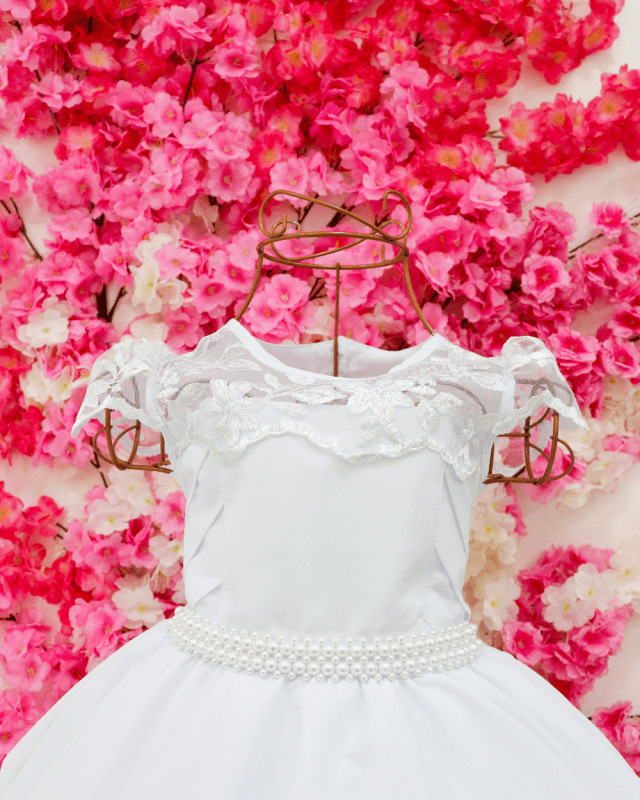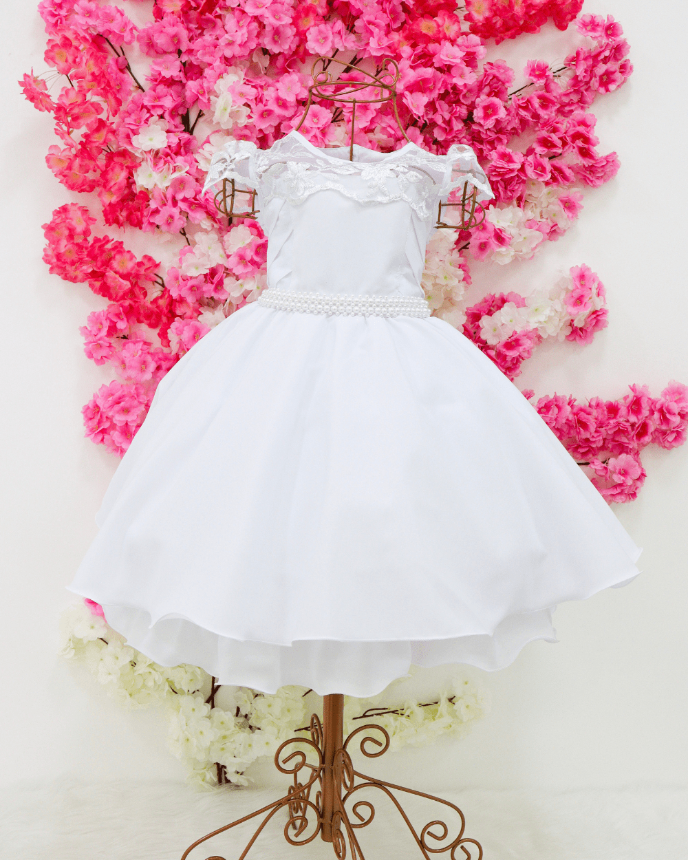 Vestido flu-flu, manga curta branco, com detalhes em seu corpo super delicado saia lisa , cinto de pérolas e costa elástica para melhor ajuste ao corpo.