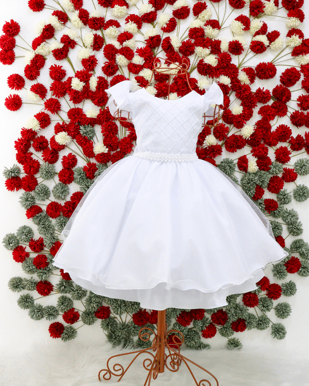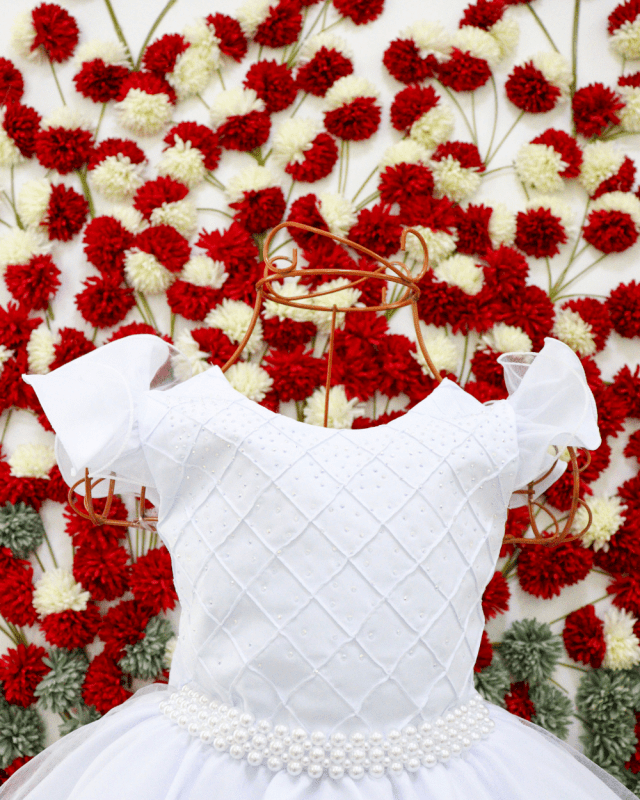 Vestido, manga curta, com peito rendado super delicado saia em tule, cinto de pérolas e costa elástica para melhor ajuste ao corpo.
