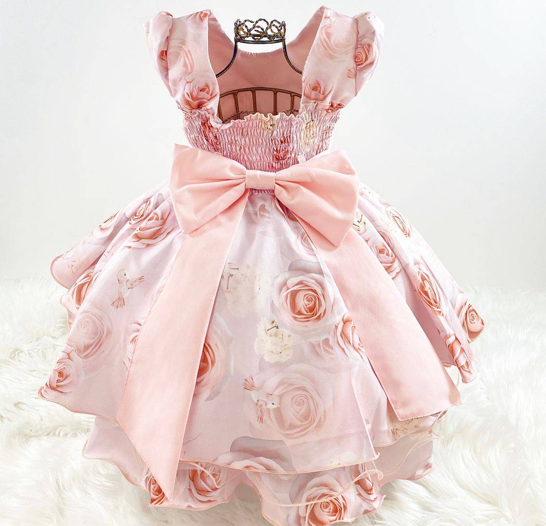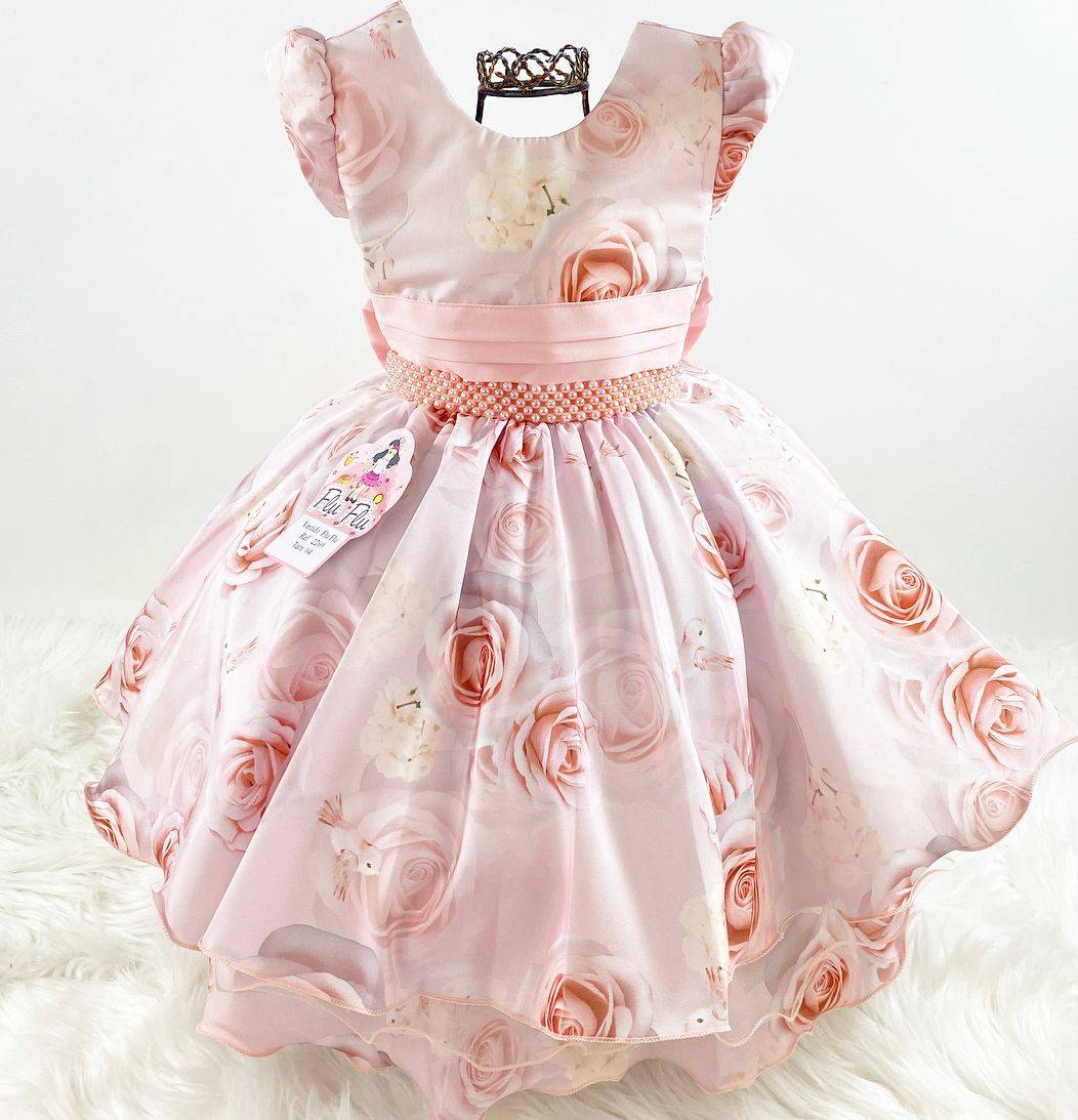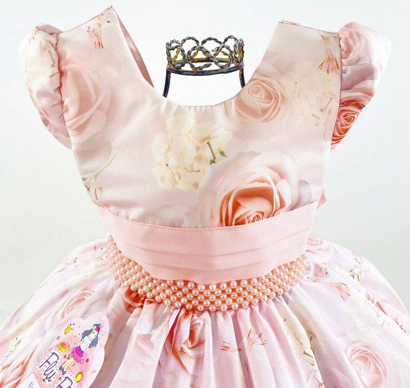 Vestido infantil manga curta , estampa floral rosê, saia acabamento simples.Cintura bordado com pérolas sintéticas. Elástico nas costas ajustável ao corpo e laço.