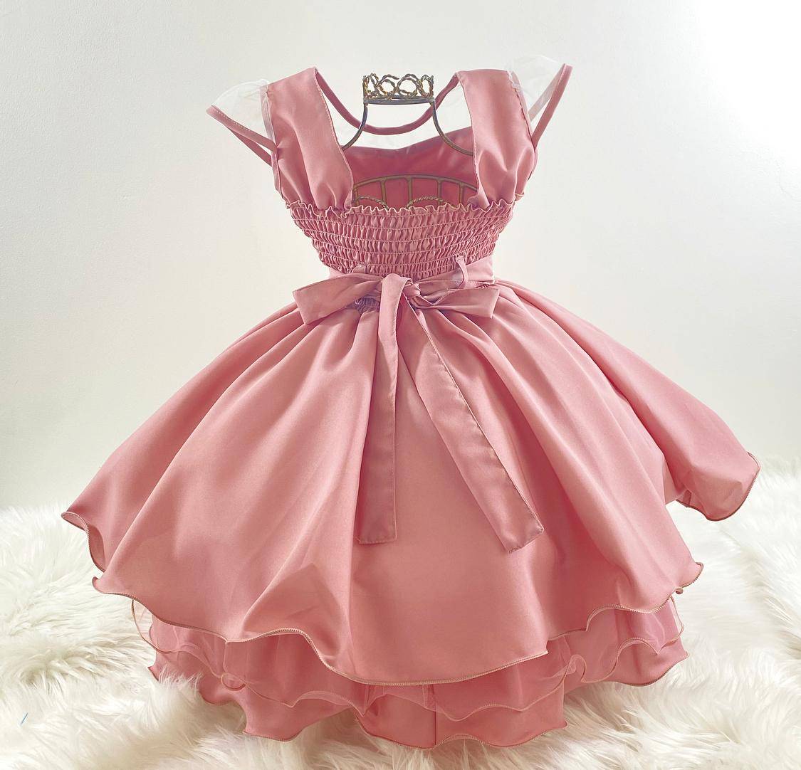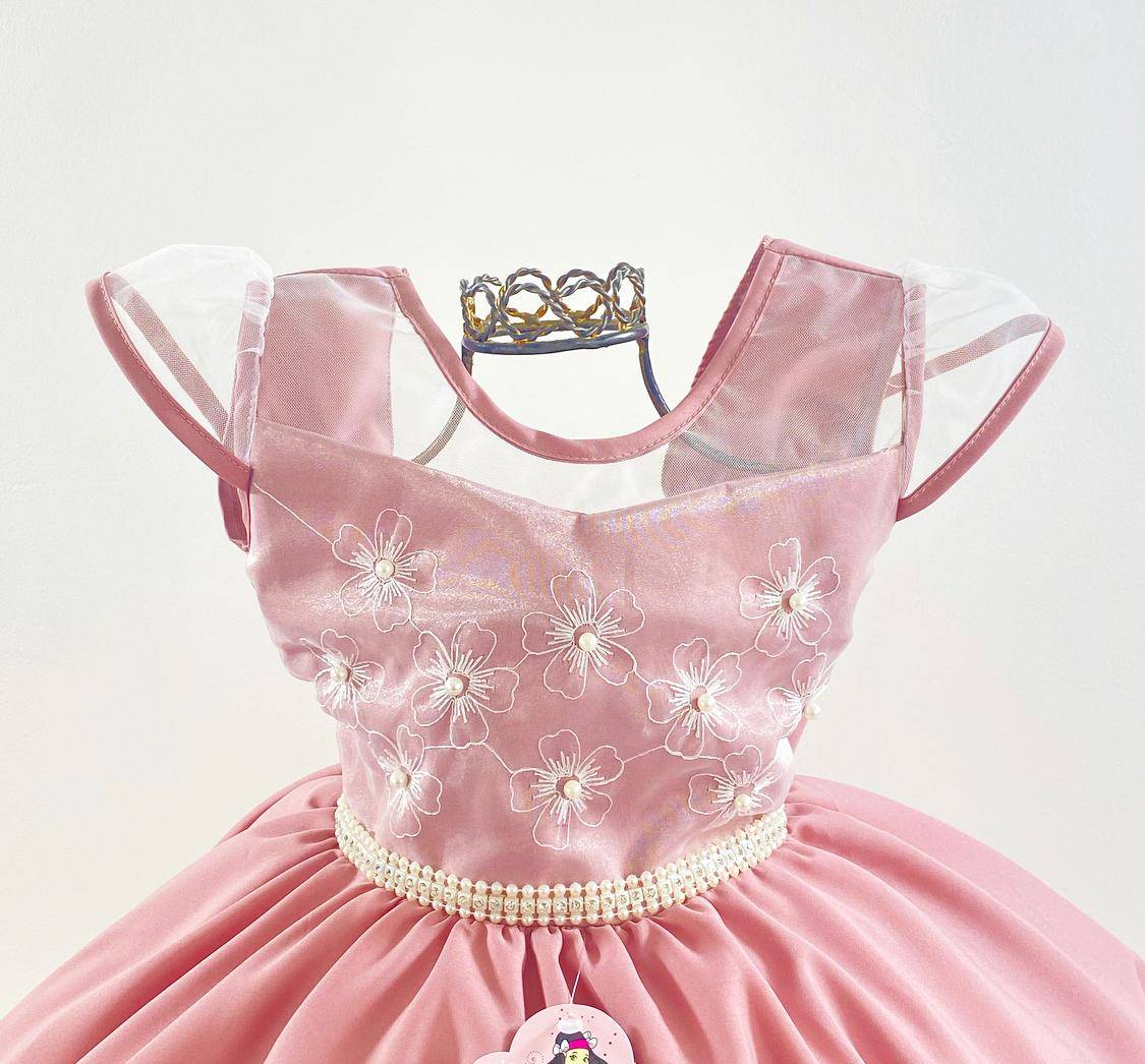 Vestido infantil manga curta, peito tule bordado florzinha com aplicação de pérolas sintéticas, saia lisa, com três babados. Cintura com pérolas sintéticas e strass. Elástico nas costas ajustável ao corpo.