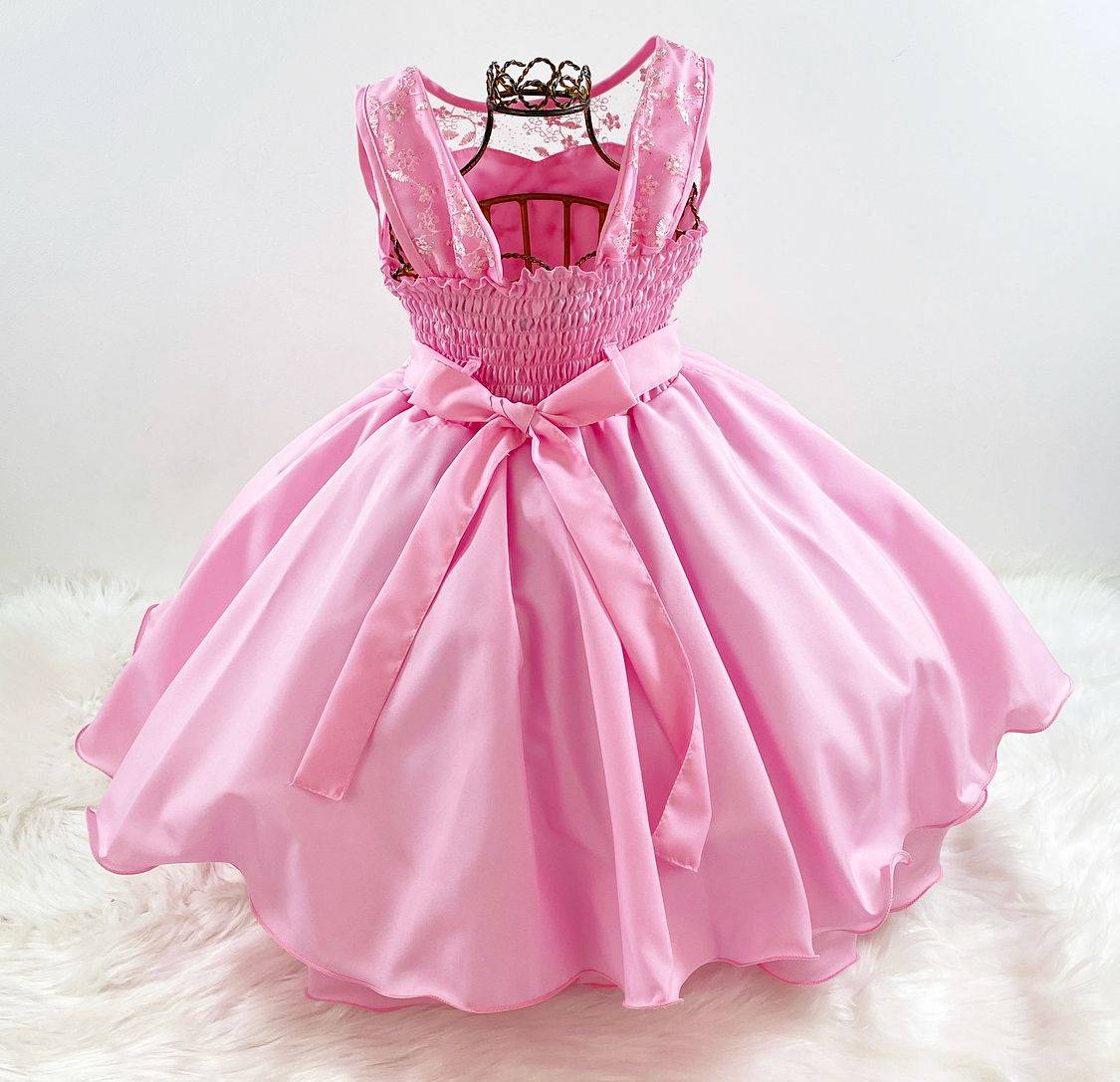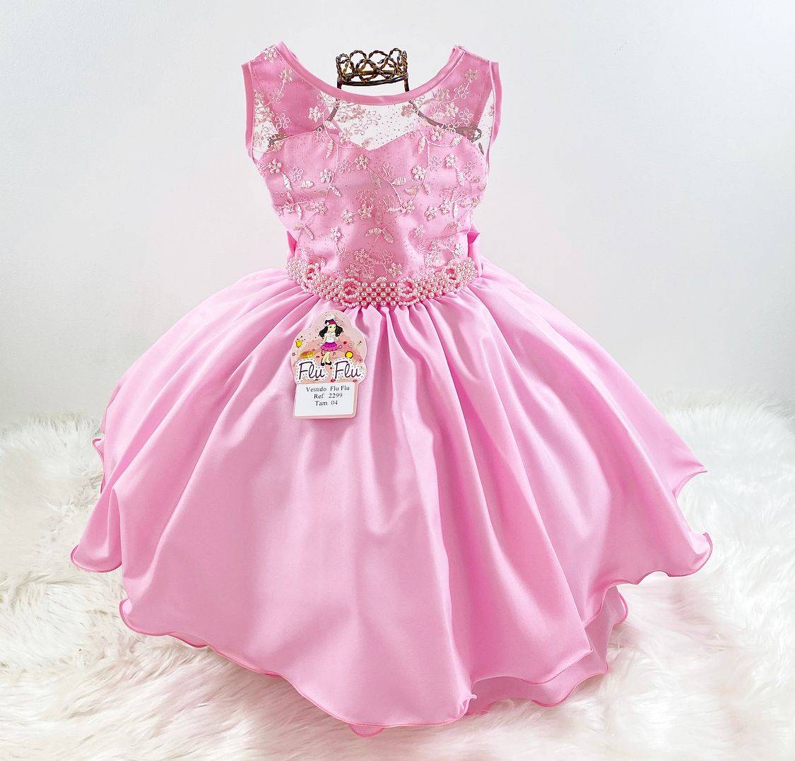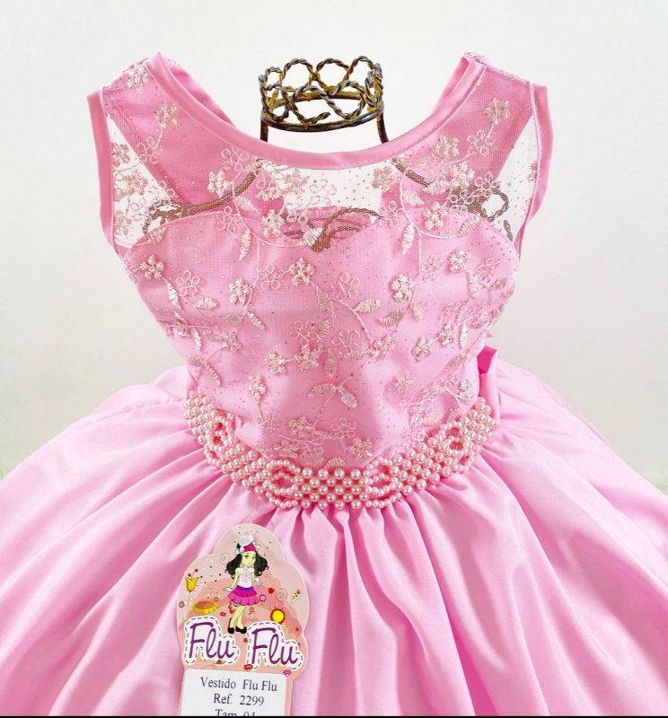 Vestido infantil regata , peito com com renda bordado com pérolas sintéticas ,saia lisa acabamento simples. Cintura com bordado de pérolas sintéticas. Nas costas contém elástico ajustável ao corpo , faixa e laço broche.