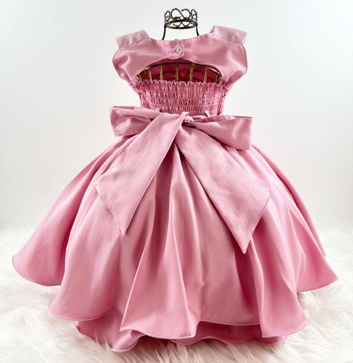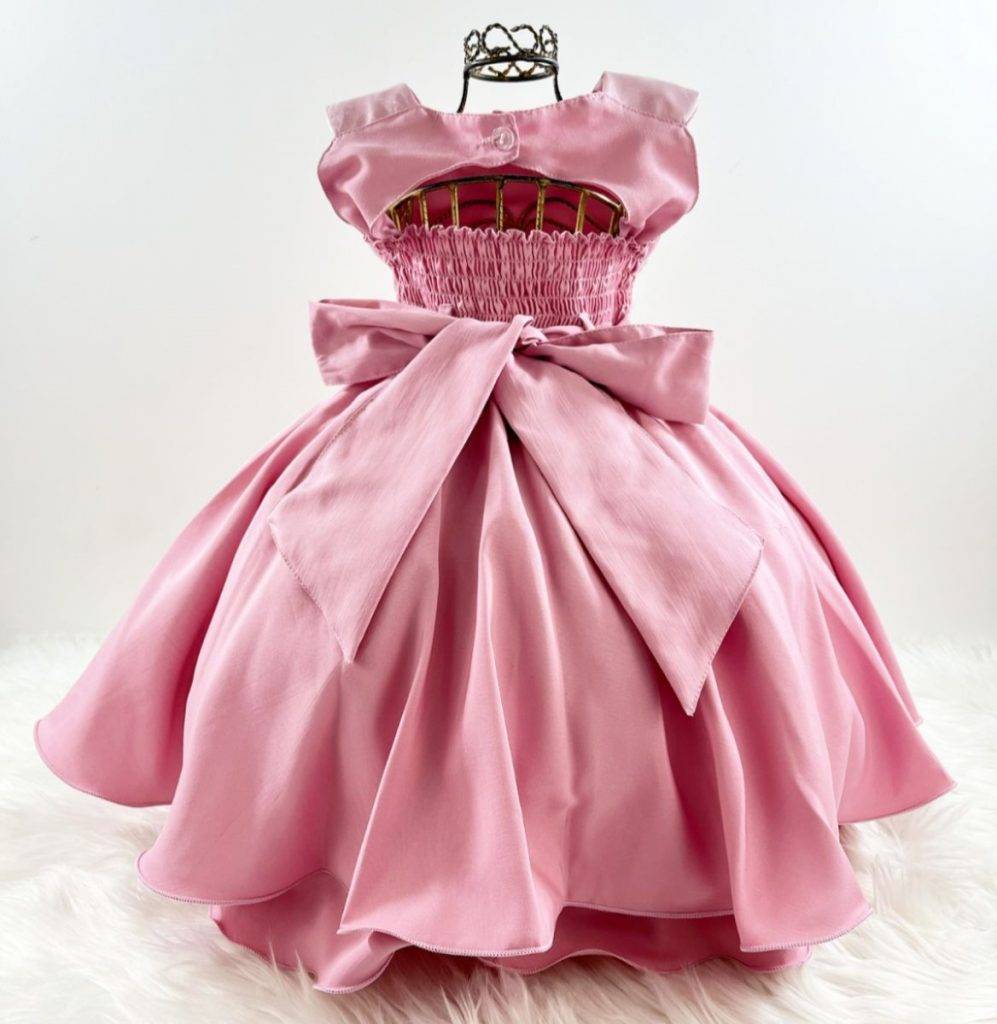 Vestido infantil manga curta, peito com renda, saia lisa . Cintura com pérolas sintéticas. Elástico nas costas ajustável ao corpo.