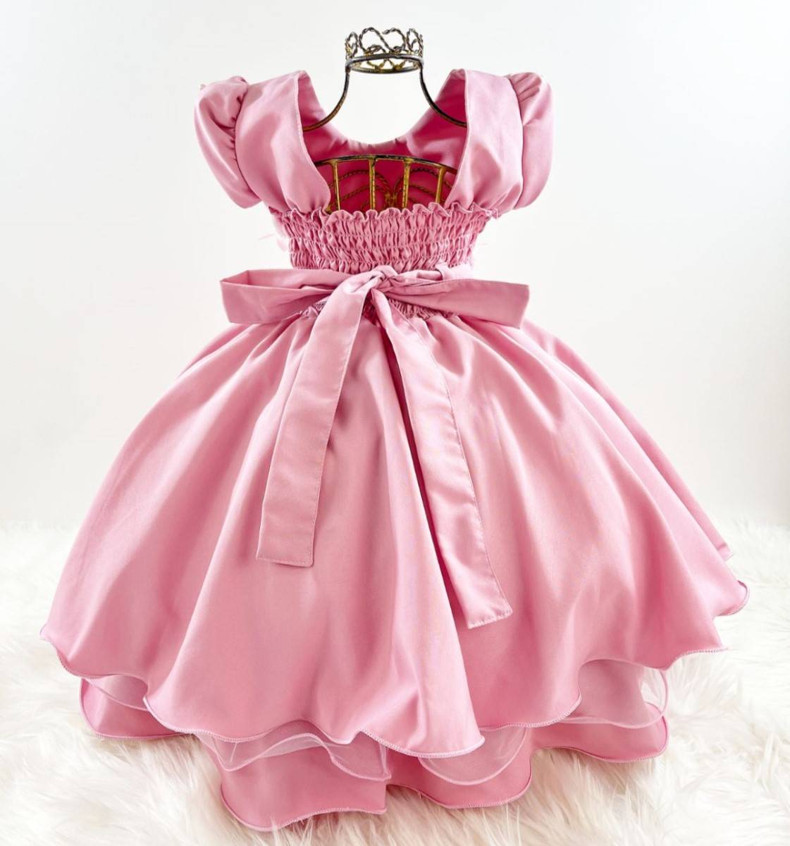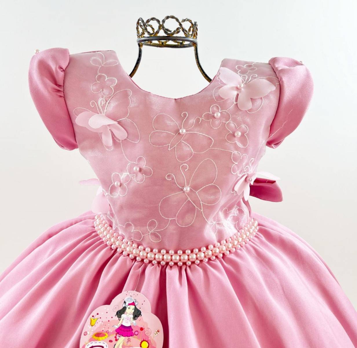 Vestido infantil manga curta, peito com renda, saia lisa . Cintura com pérolas sintéticas. Elástico nas costas ajustável ao corpo.