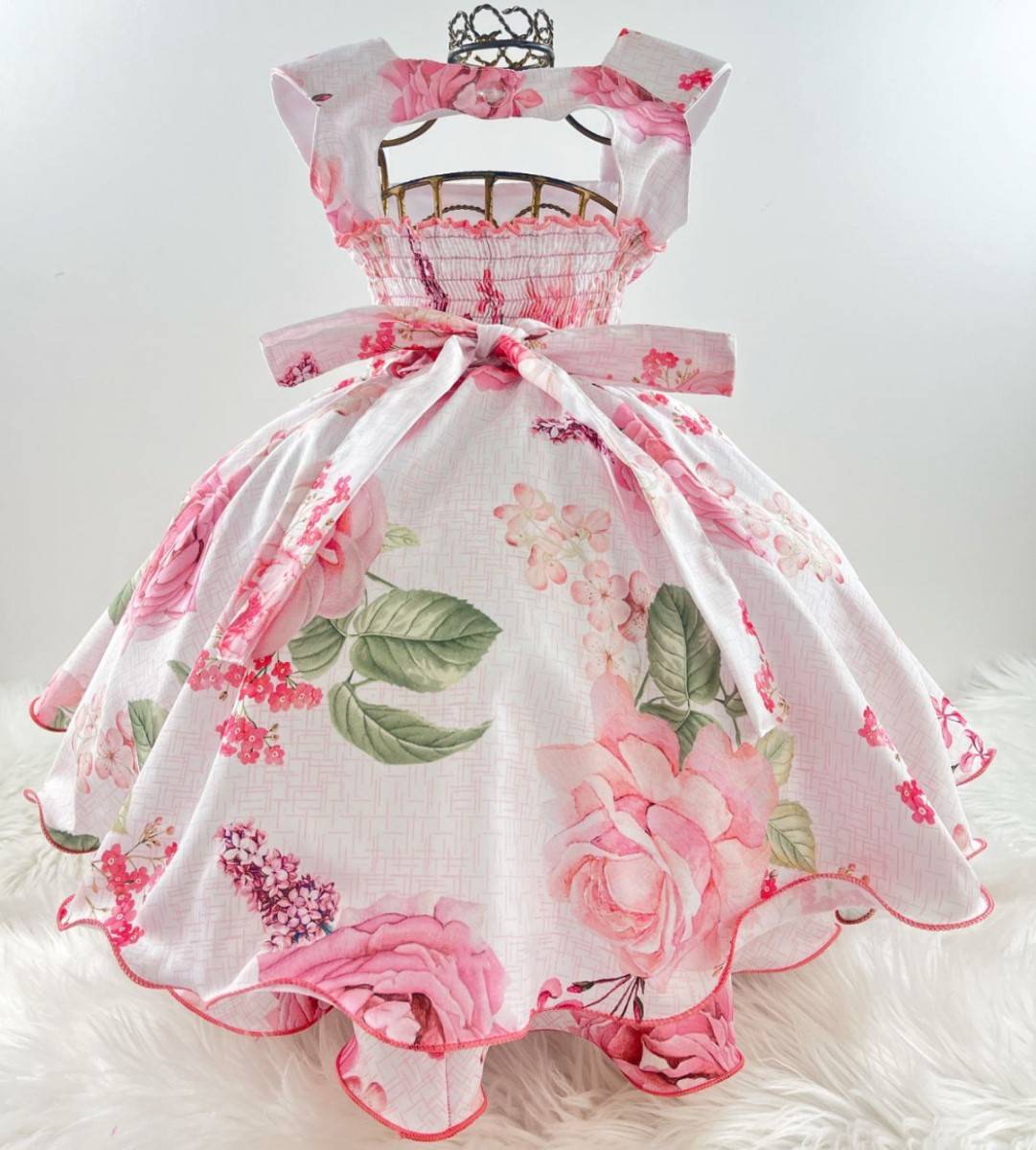 Vestido infantil regata, peito e saia estampa floral .Cintura com pérolas sintéticas. Elástico nas costas ajustável ao corpo.