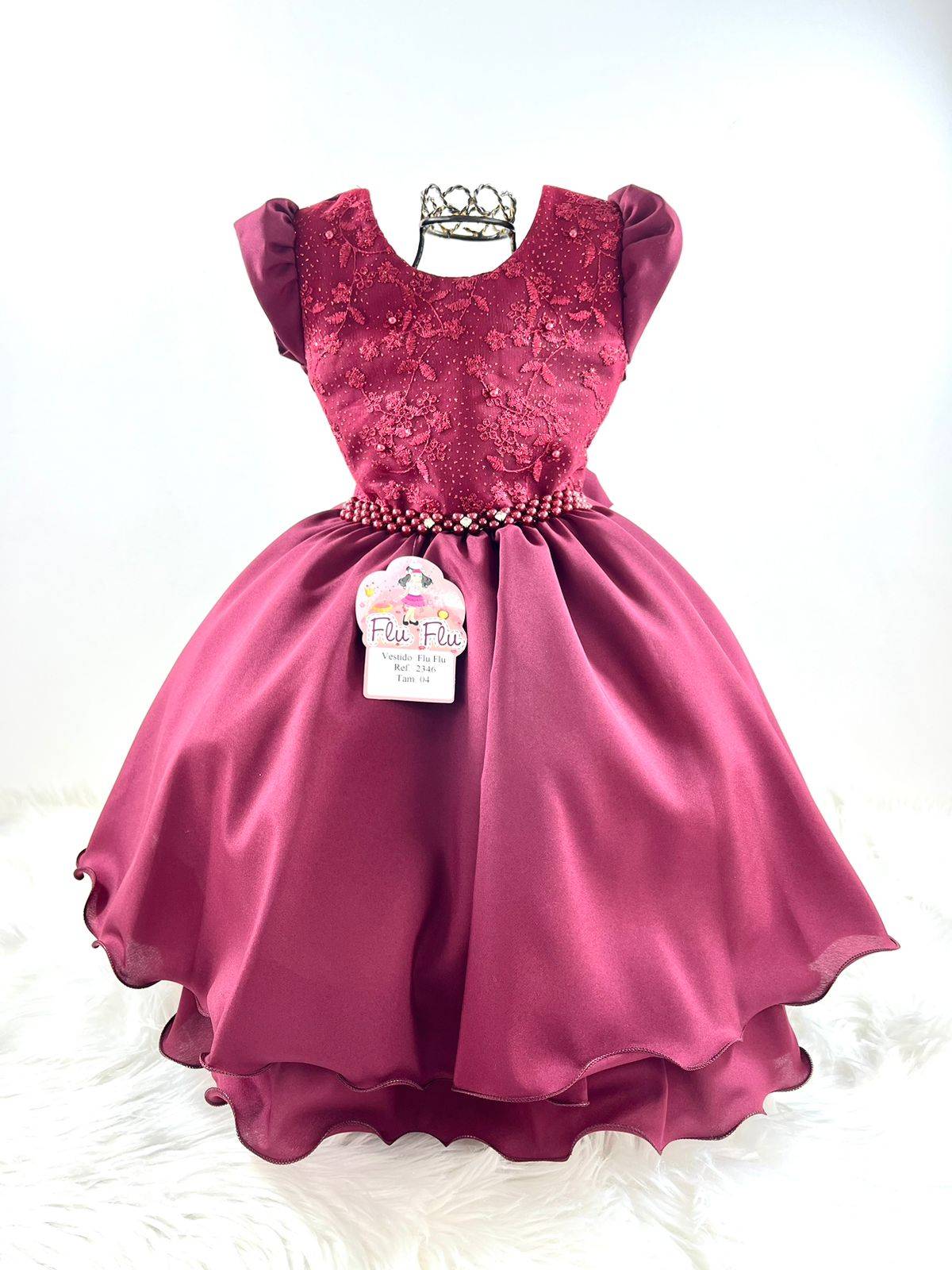 Vestido infantil manga curta, peito com renda e detalhes de pérolas sintéticas, saia lisa . Cintura com pérolas sintéticas. Elástico nas costas ajustável ao corpo.